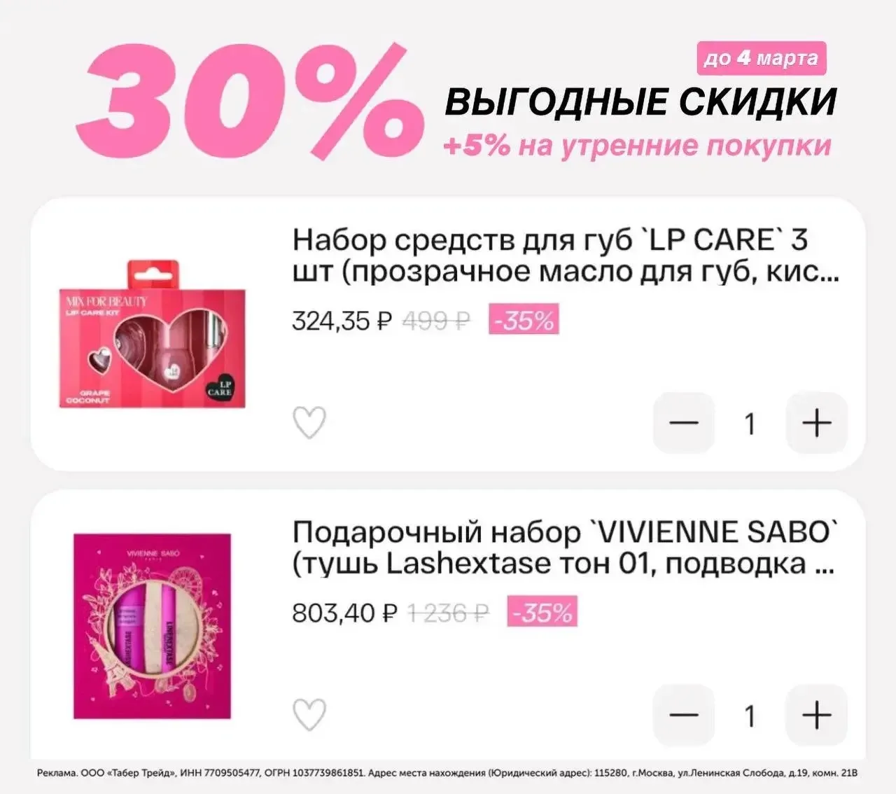 Реклама. ООО «Табер Трейд», ИНН 7709505477, ОГРН 1037739861851. Адрес места нахождения (Юридический адрес): 115280, г.Москва, ул.Ленинская Слобода, д.19, комн. 21В