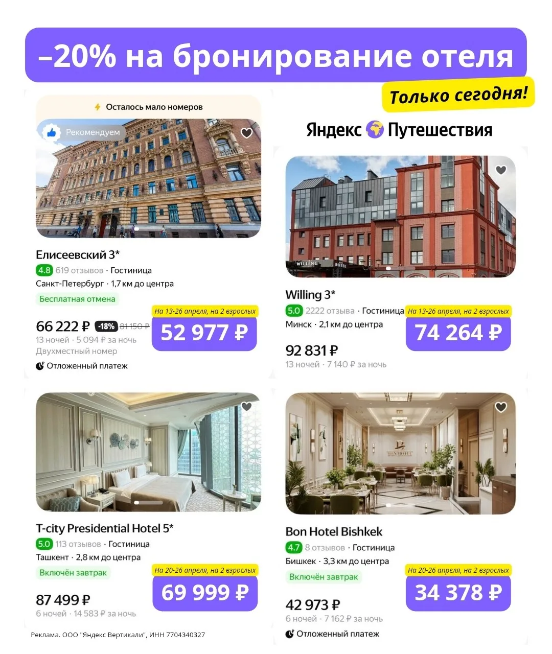 ** Скидка действует для всех пользователей, в мобильном приложении и на сайте. Распространяется на даты бронирований с выездом до 30.04.2026. Не суммируется с баллами Плюса.
