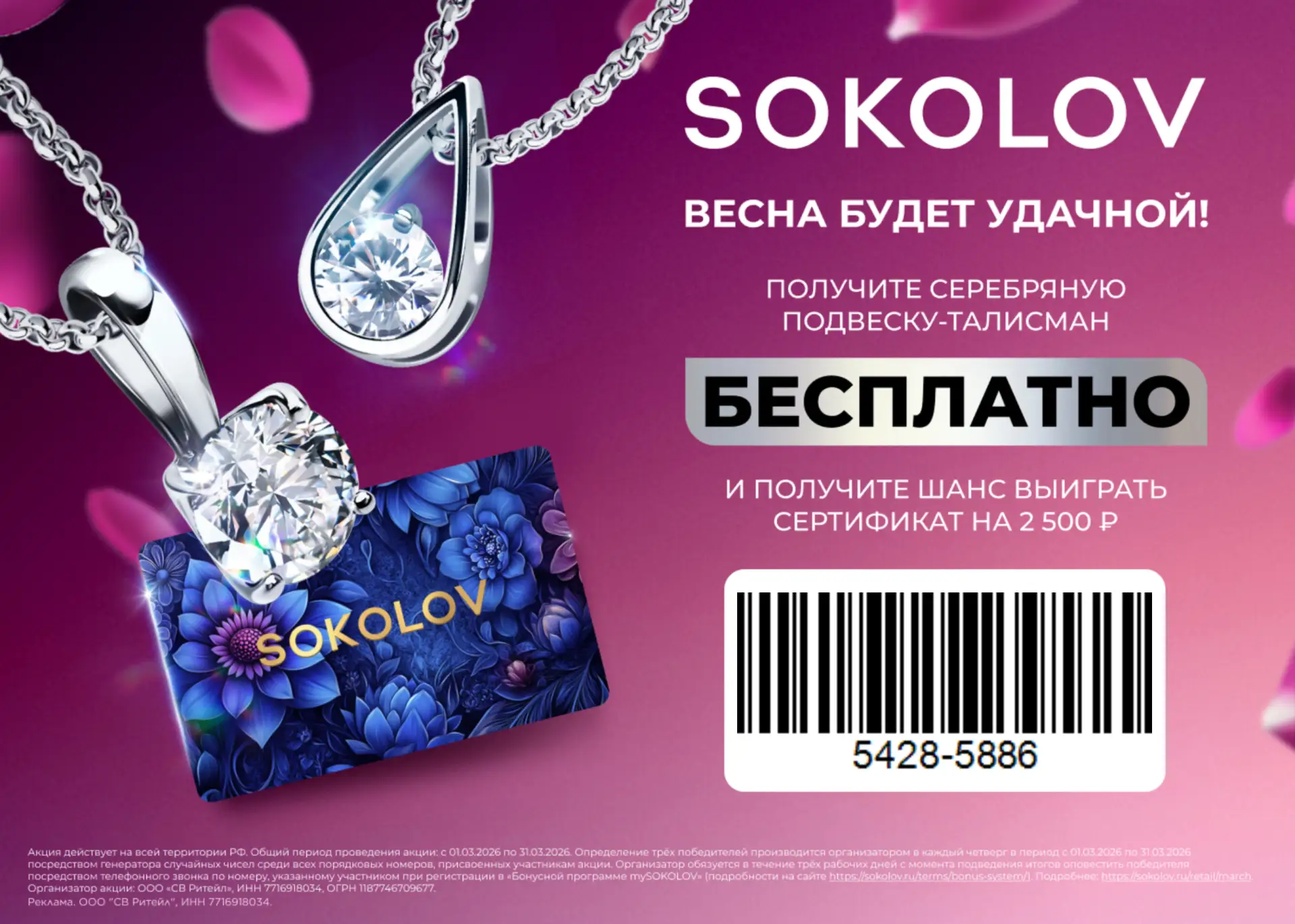 Только с 1 по 31 марта получи подвеску по штрихкоду и автоматически стань участником розыгрыша сертификатов на 2 500 ₽ от SOKOLOV!