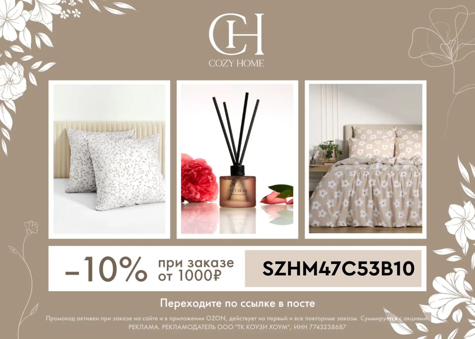 В Cozy Home на Ozon и применяйте скидку 10% от 1000₽ по промокоду ➡️ SZHM47C53B10