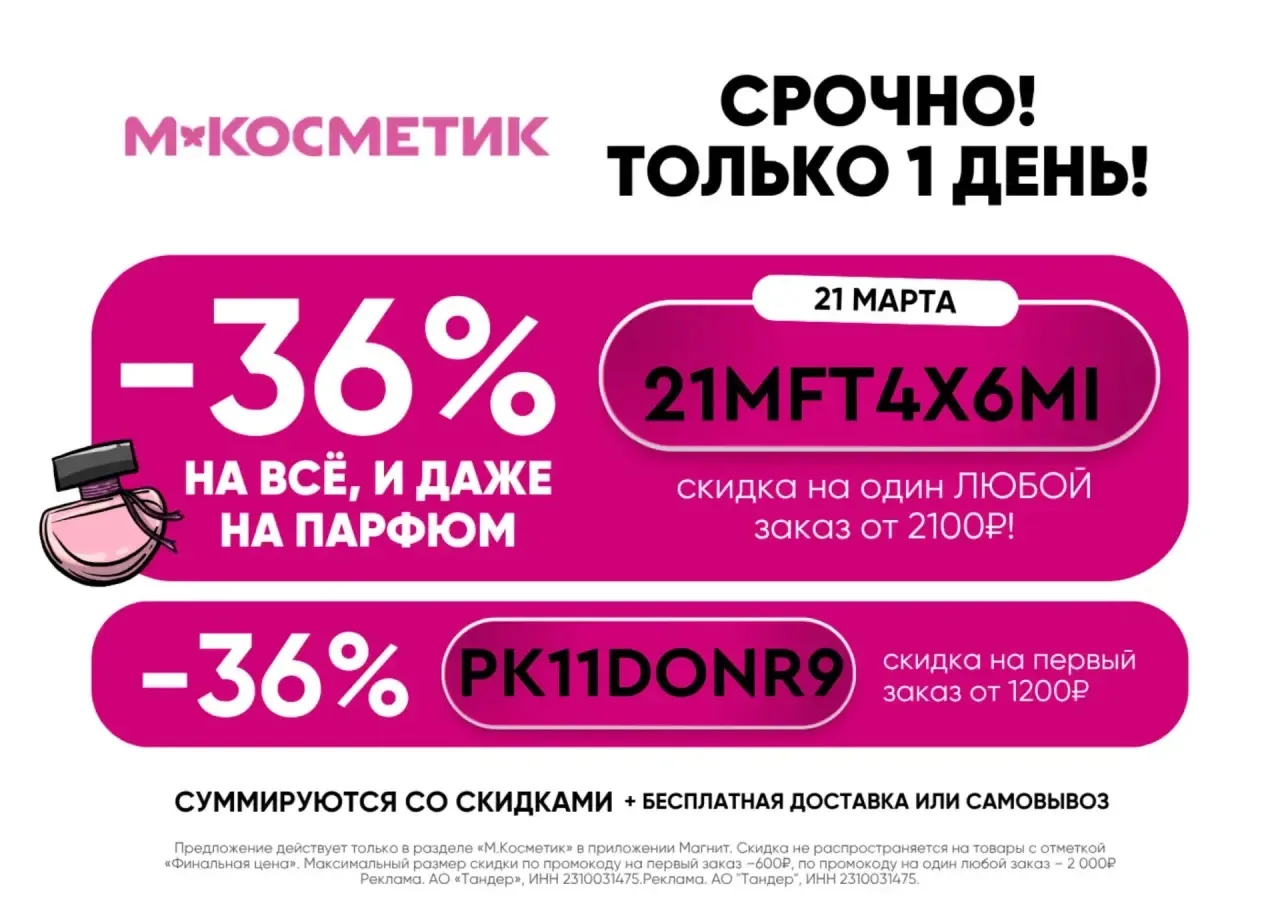 Бонусы суммируются со скидками. Максимальный размер скидки по промокоду 36% - 500 ₽, по промокоду на любой заказ - 1000 ₽. Не распространяются на товары из разделов: «Магнит Косметик», «Магнит Гипермаркет», «Аптека» и «Финальная цена».