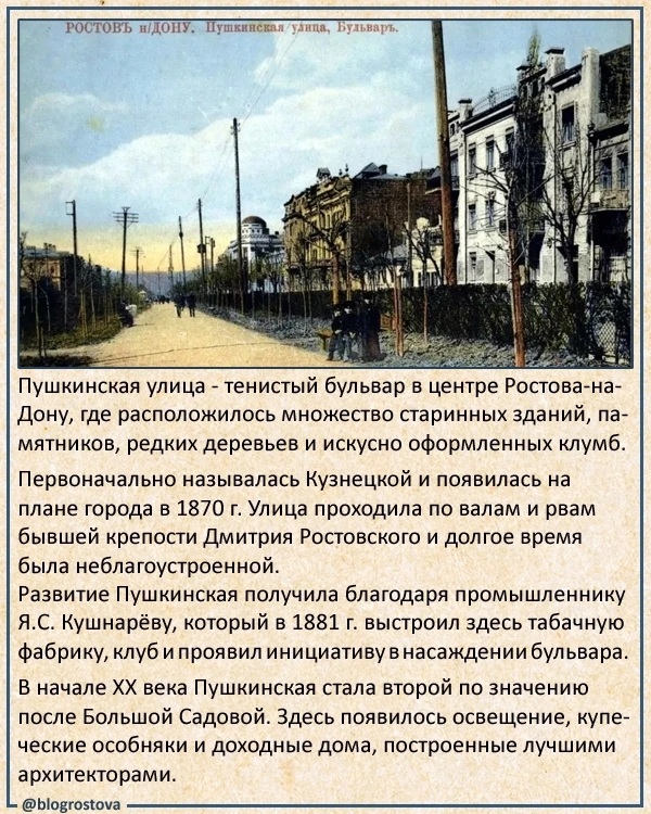 Кстати, Пушкинской улица стала в 1885 году, когда городская Дума решила переименовать её в честь великого поэта А. С. Пушкина, который пару раз бывал в Ростове проездом. Спасибо Александру Сергеевичу! Кузнецкая звучит значительно хуже и не так романтично 😁 Девушку на Кузнецкую уже не позовешь 😂