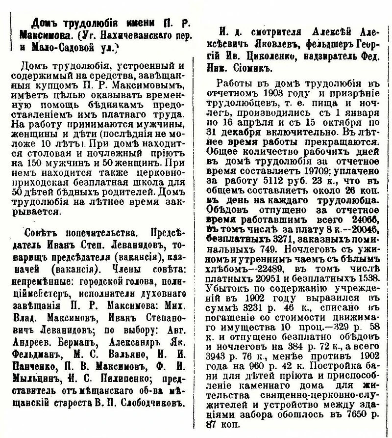 Ростовский Дом трудолюбия стал первым и единственным в России благотворительным учреждением, названным именем местного купца. Максимов завещал 200 тысяч рублей на создание и содержание этого благотворительного учреждения, однако дом трудолюбия был построен уже после его смерти (умер в 1895 году).