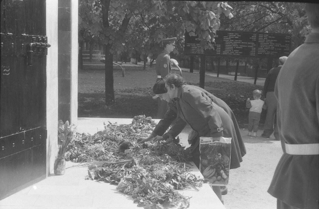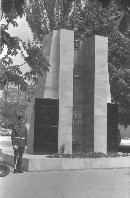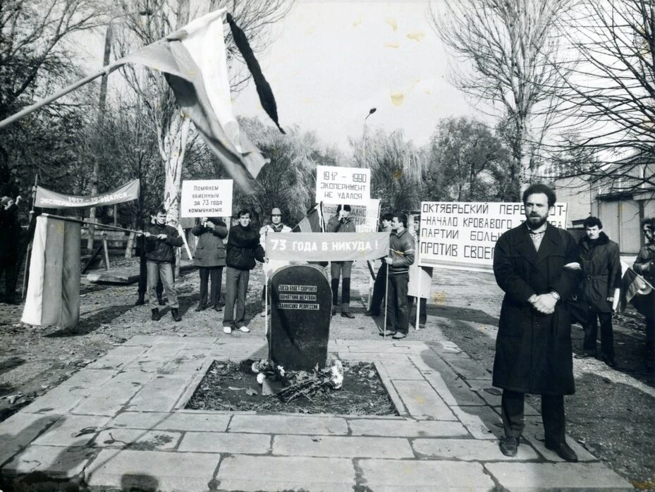 7 ноября 1990 года (✅Фото 1) там проходила демонстрация, обличающая ужасы советского режима. Однако в 1988 году на том же месте был просто сквер с лавочками (✅Фото 2) и об ужасах никто не вспоминал. А значит надгробие, которое позже превратится в памятник, появилось как раз где-то в начале 1990 года.