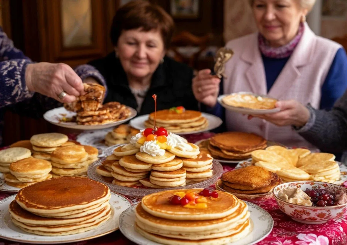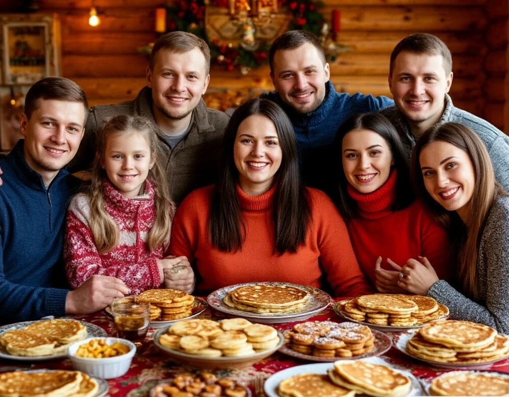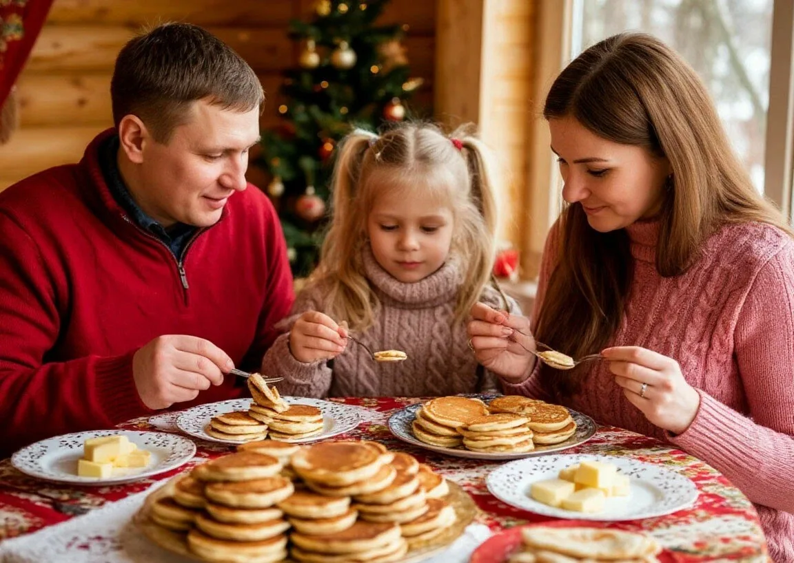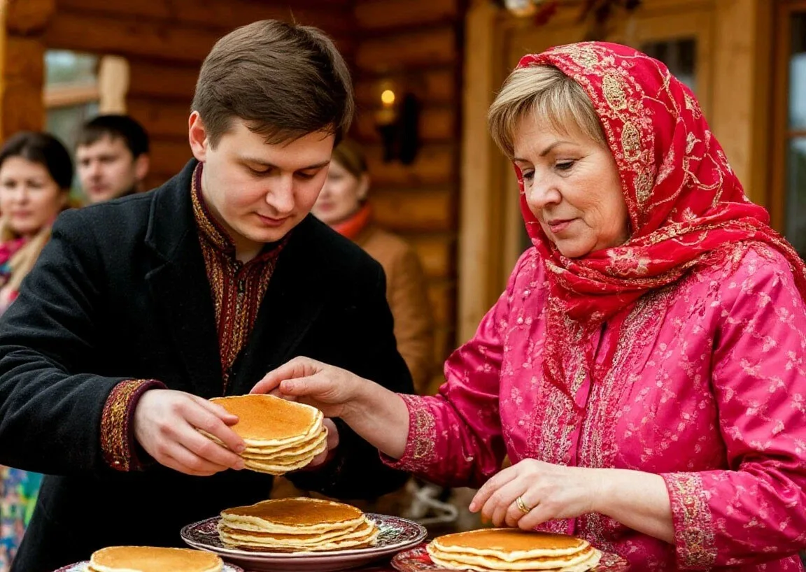 Время щедрых угощений. На столах - блины с разными начинками, а зятья по традиции идут в гости к тёщам.