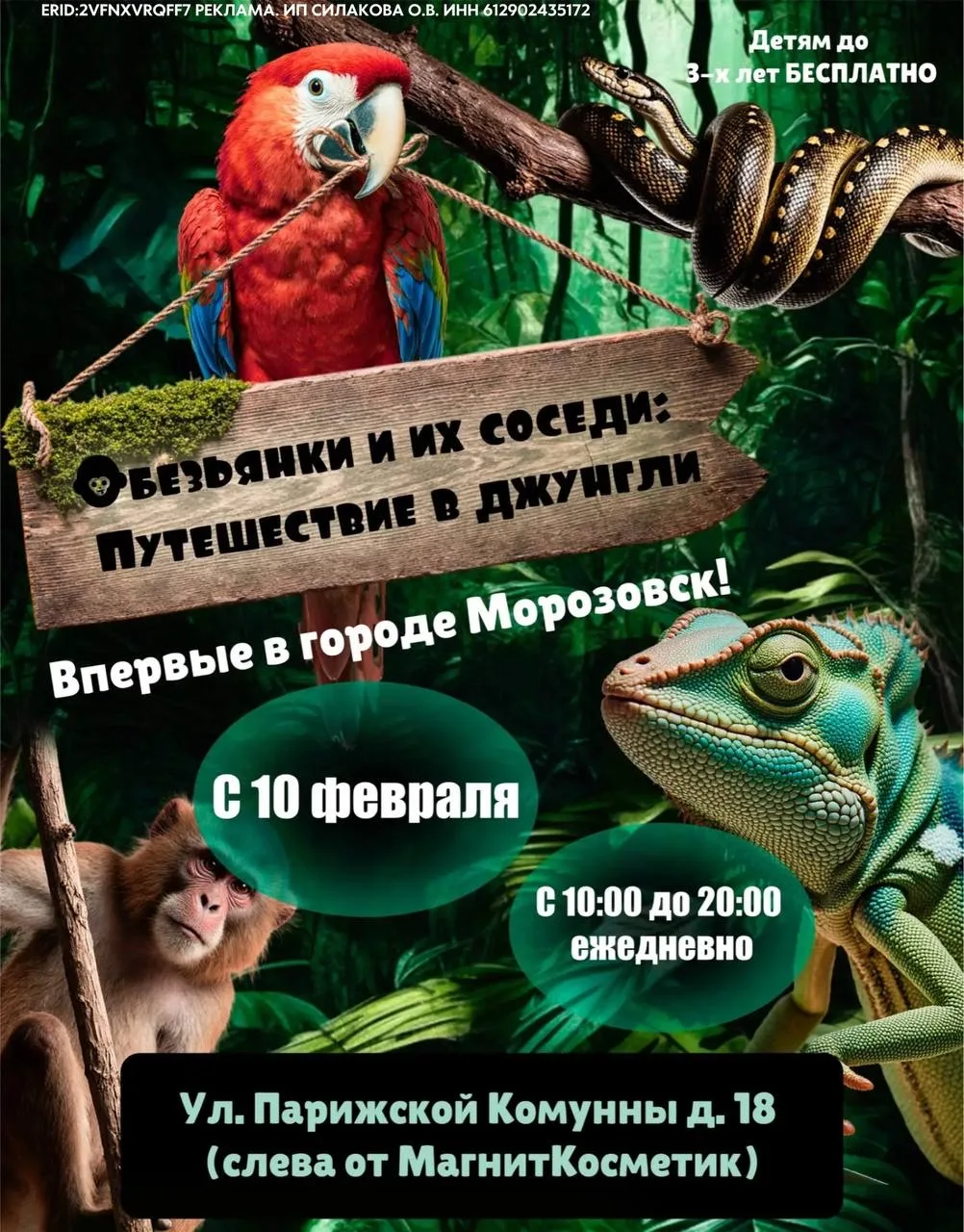 С 10.02.26 г в Морозовске работает выставка экзотических животных — «Обезьянки и их соседи»