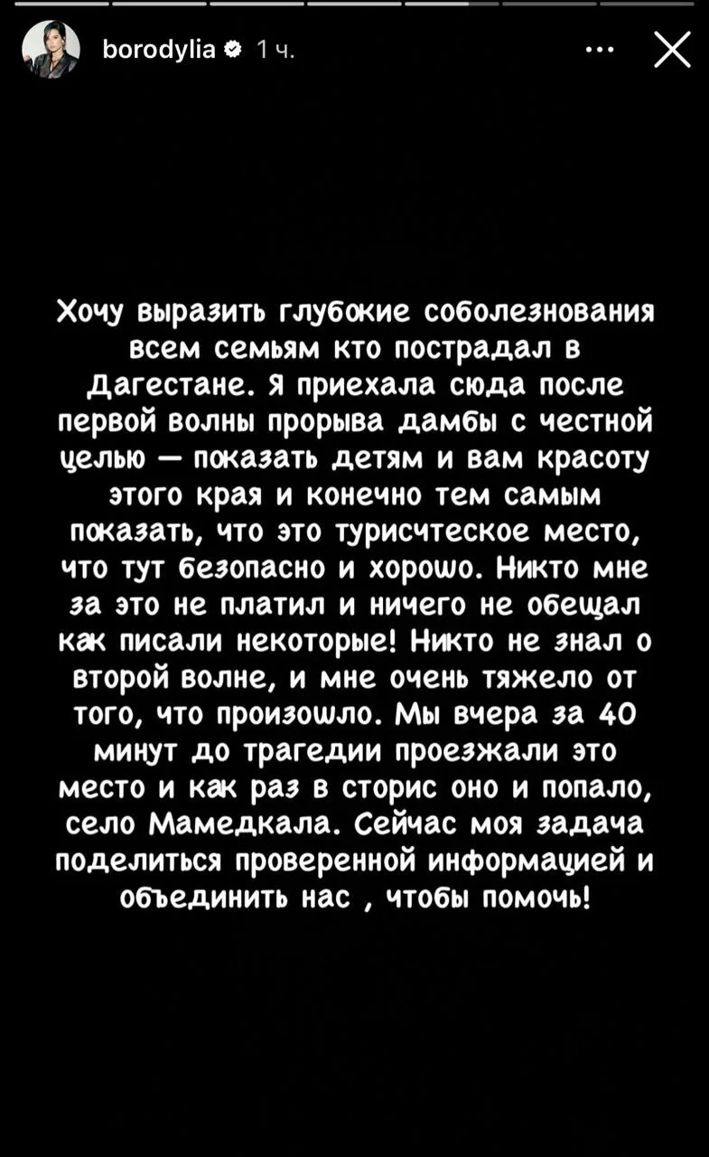 «Хочу выразить глубокие соболезнования всем семьям, кто пострадал в Дагестане. Я приехал сюда после первой волны прорыва дамбы с честной целью - показать детям и вам красоту этого края и конечно тем самым показать, что это туристическое место, что ту безопасно и хорошо. Никто мне за это не платил и ничего не обещал, как писали некоторые. Никто не знал о второй волне, и мне очень тяжело от того, что произошло», - отметила она.