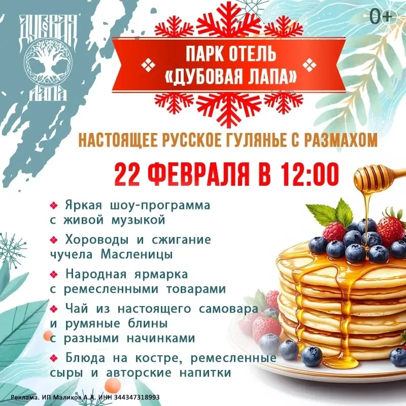 22 февраля в 12:00 парк-отель «Дубовая лапа» приглашает отметить Масленицу в настоящих русских традициях – шумно, тепло с огоньком и вкусом из детства!
