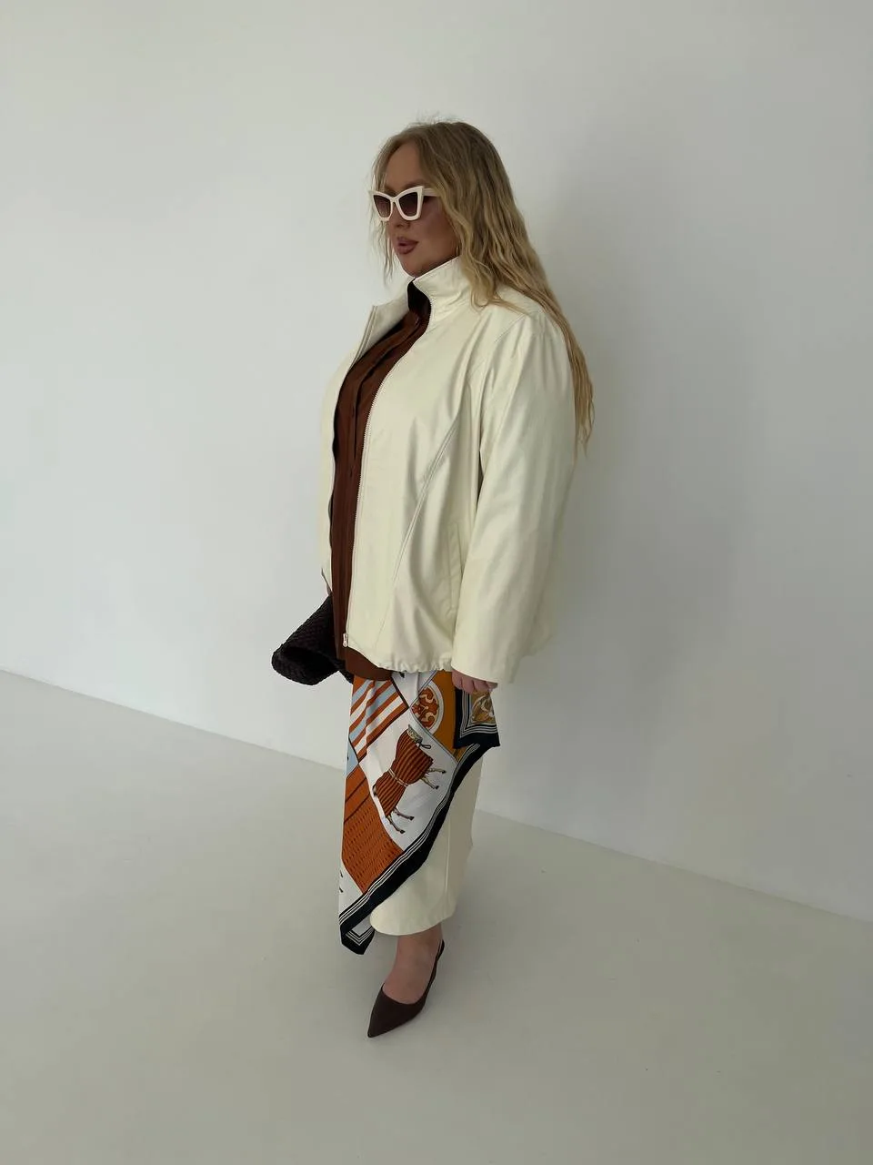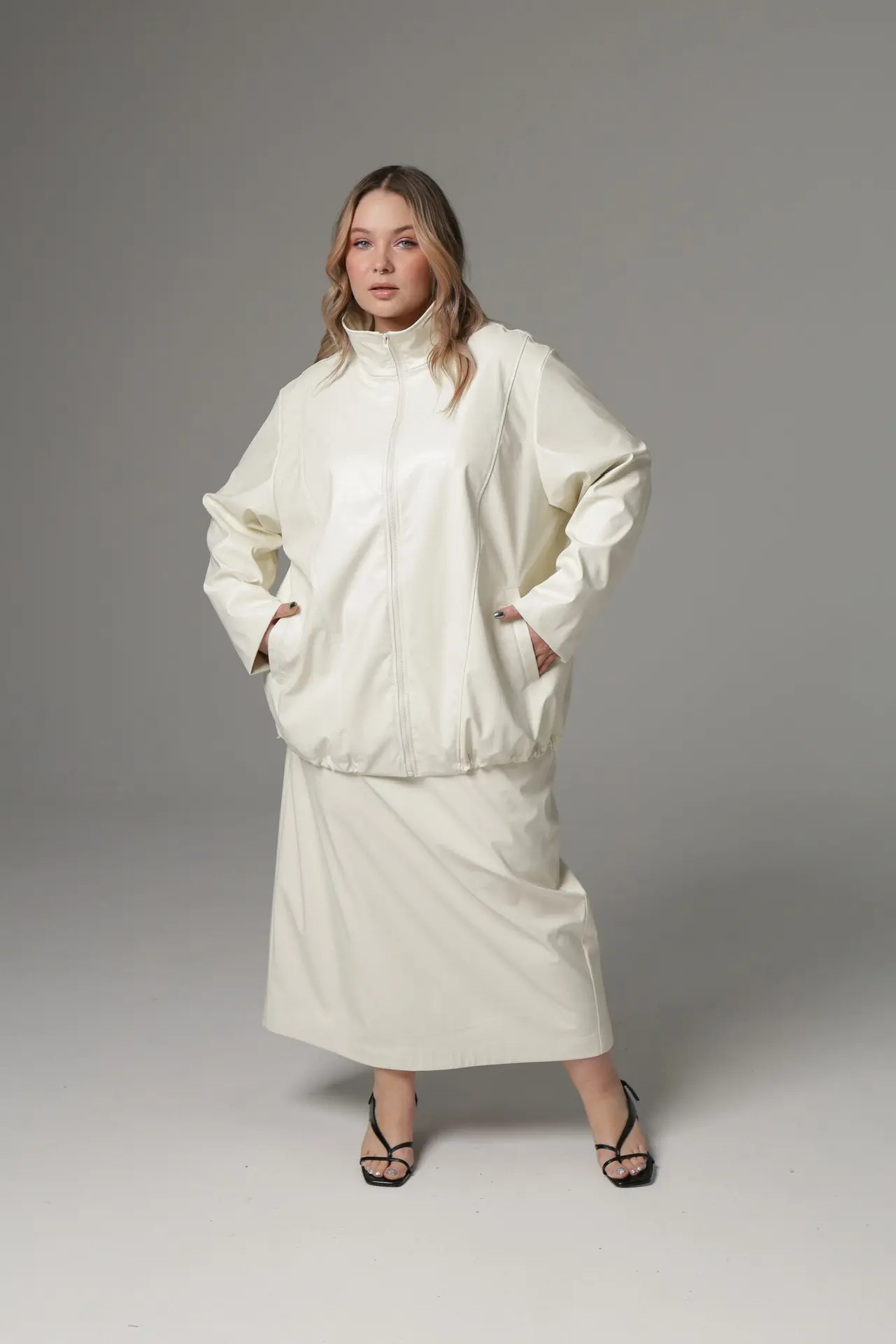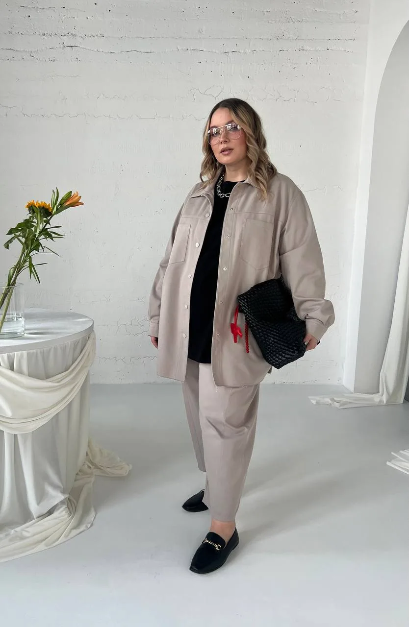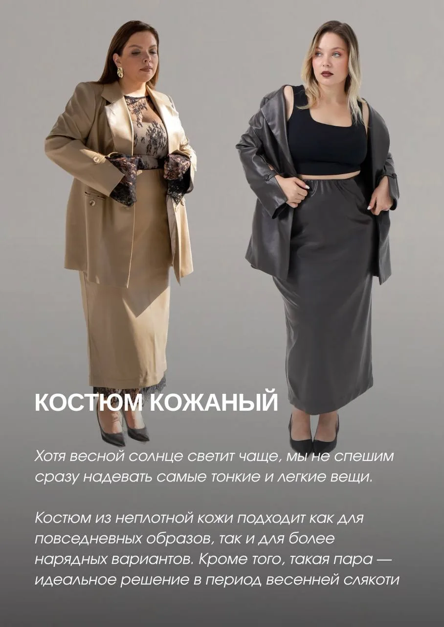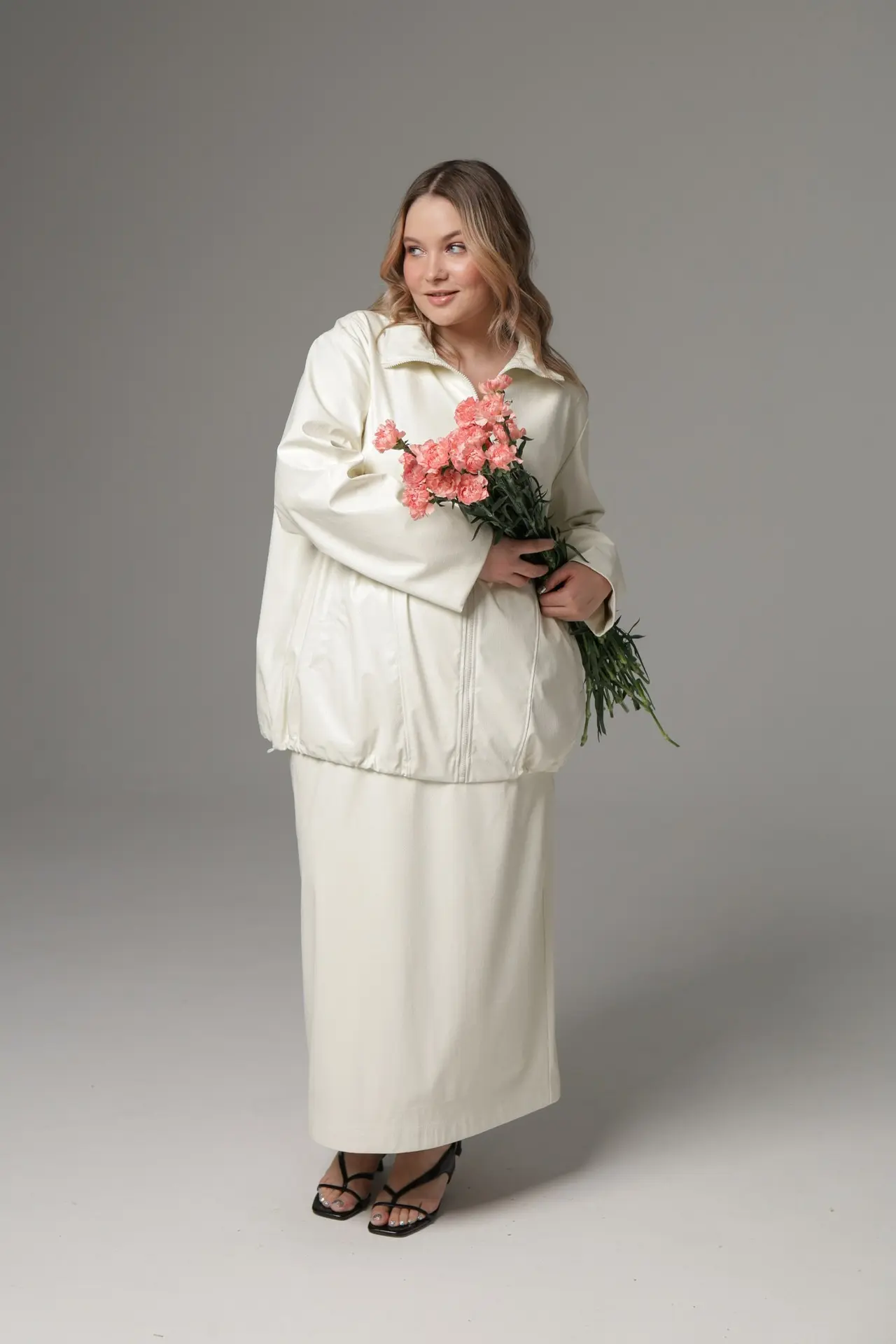 Костюм из экокожи можно носить комплектом или разбирать на образы. Куртка добавляет мягкую динамику благодаря свободному силуэту и рукавам, а юбка создаёт спокойную, вытянутую линию.