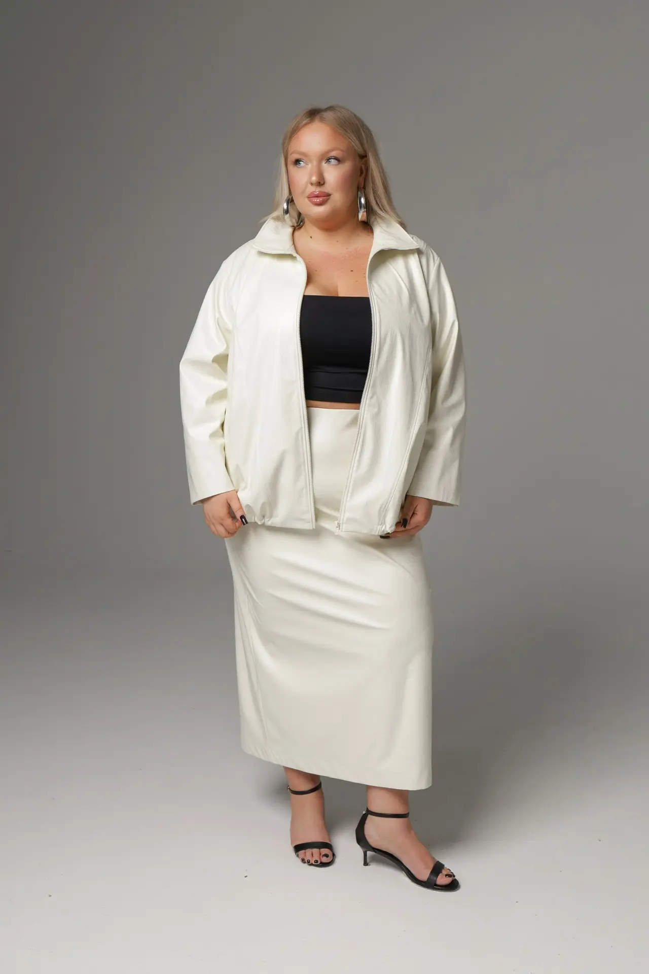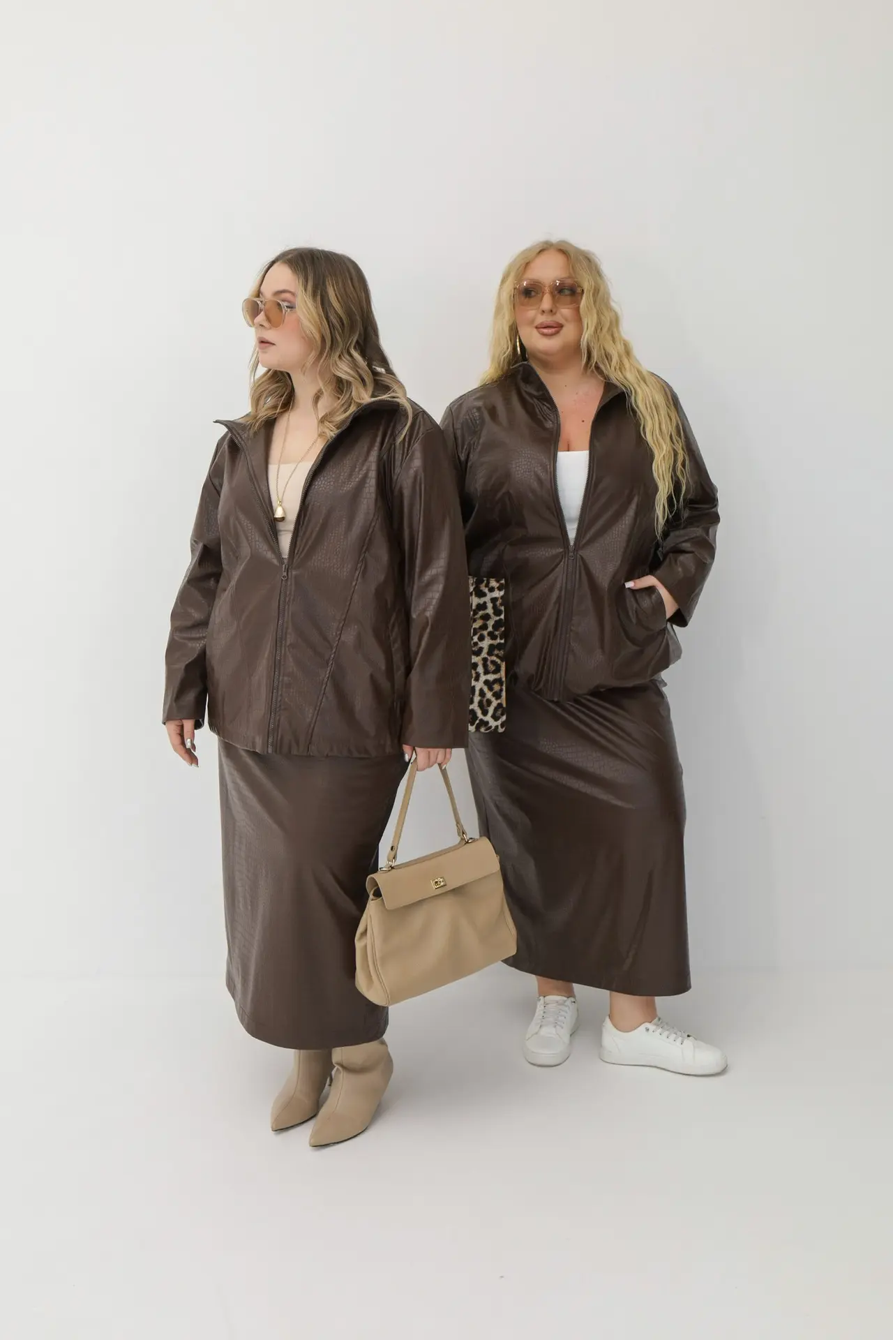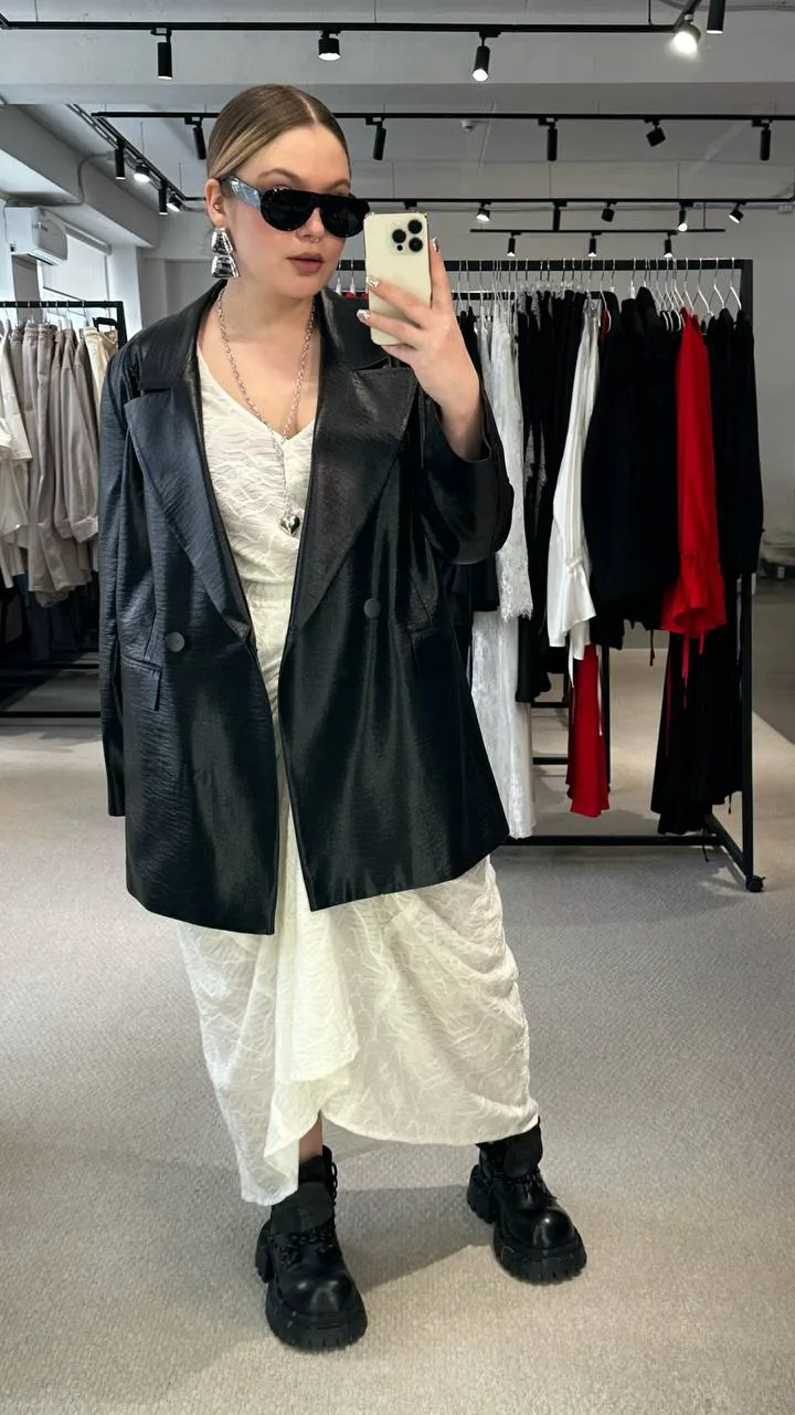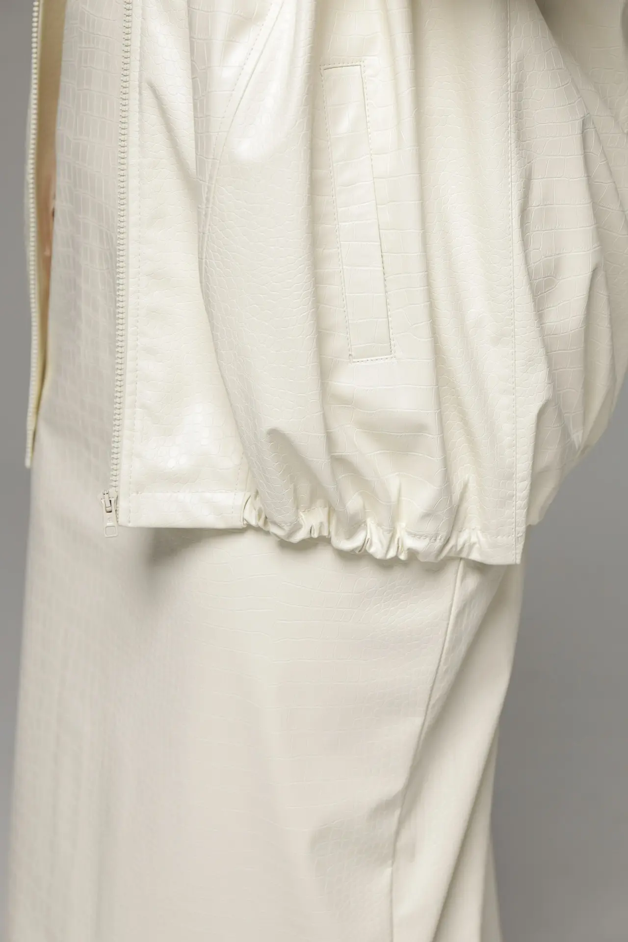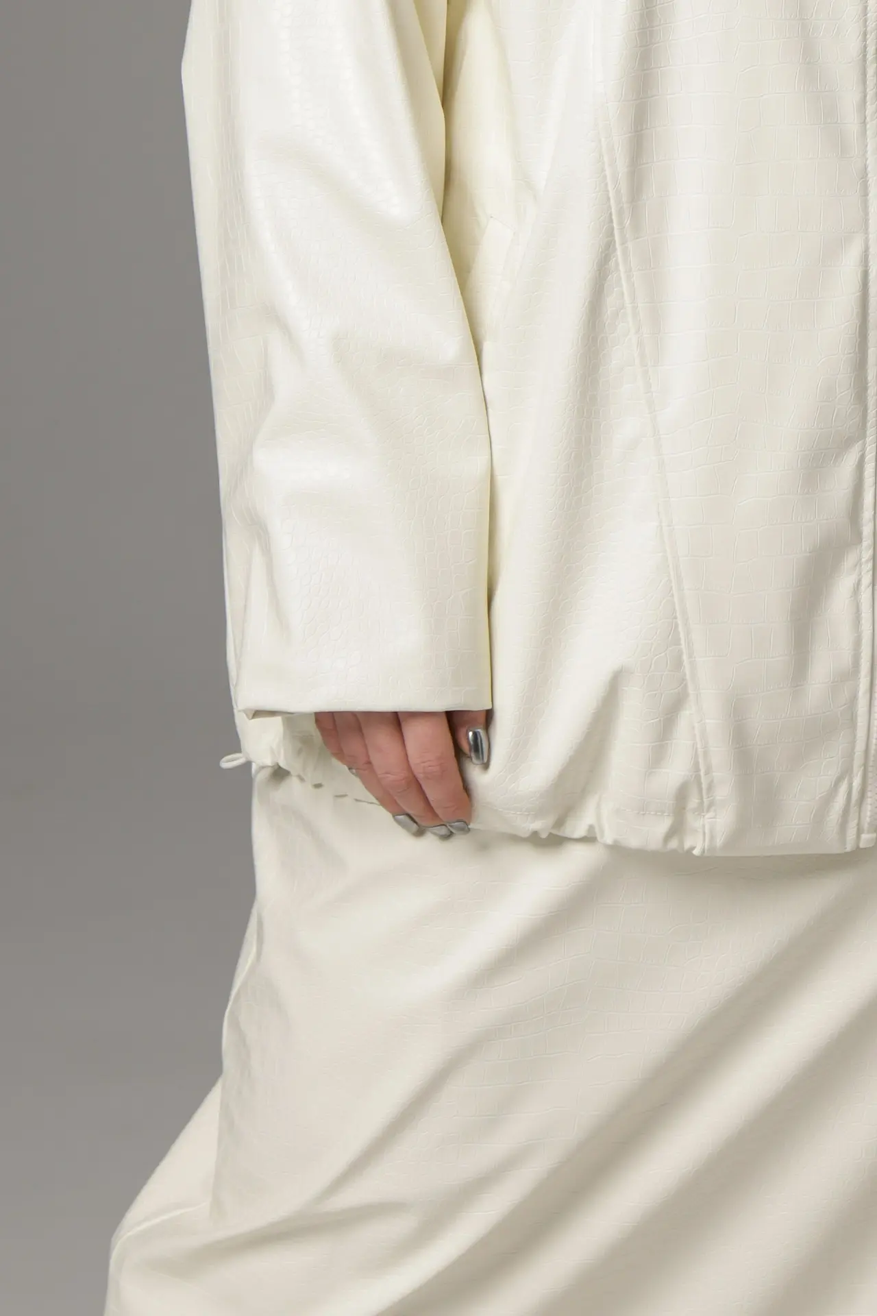 Костюм из экокожи можно носить комплектом или разбирать на образы. Куртка добавляет мягкую динамику благодаря свободному силуэту и рукавам, а юбка создаёт спокойную, вытянутую линию.