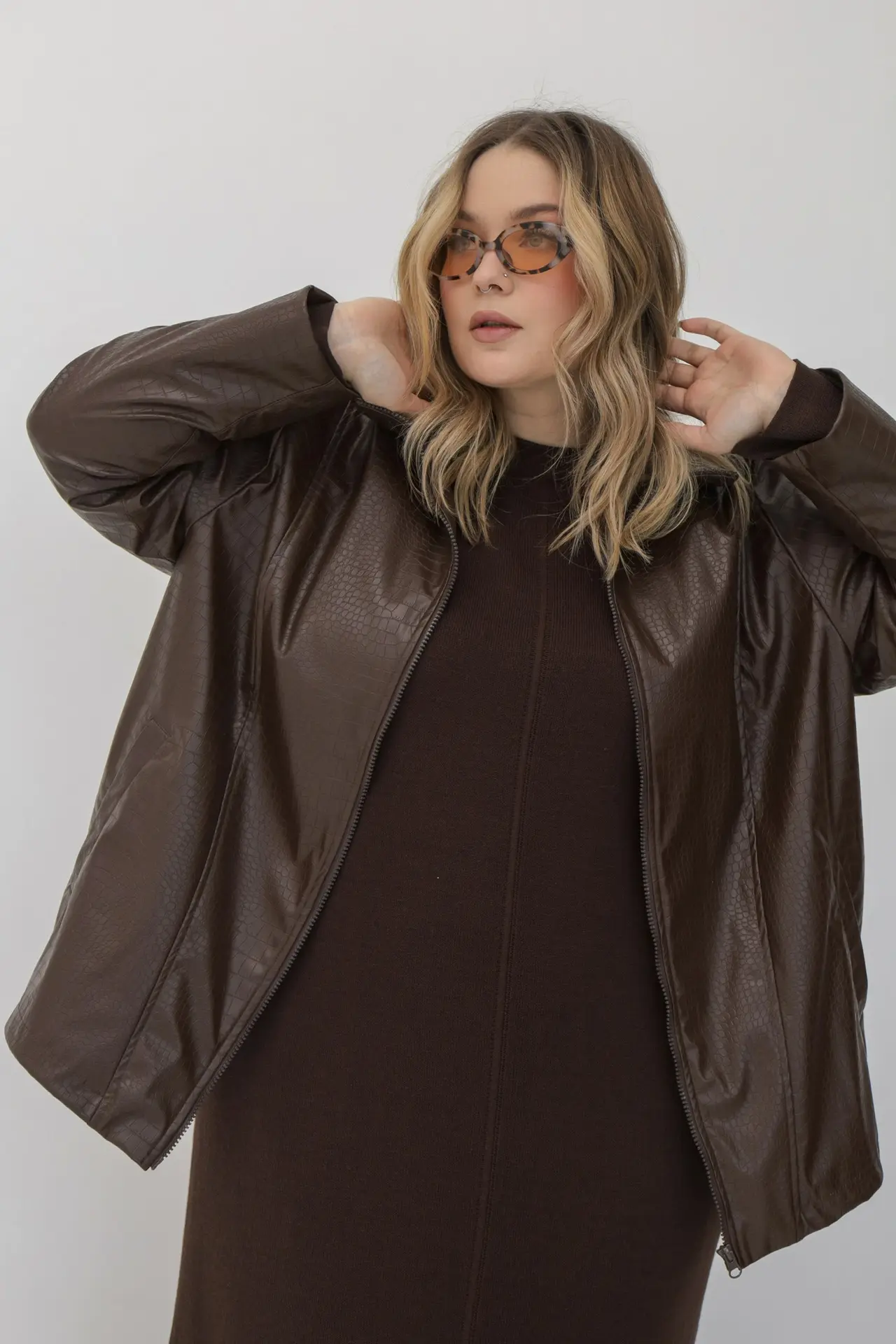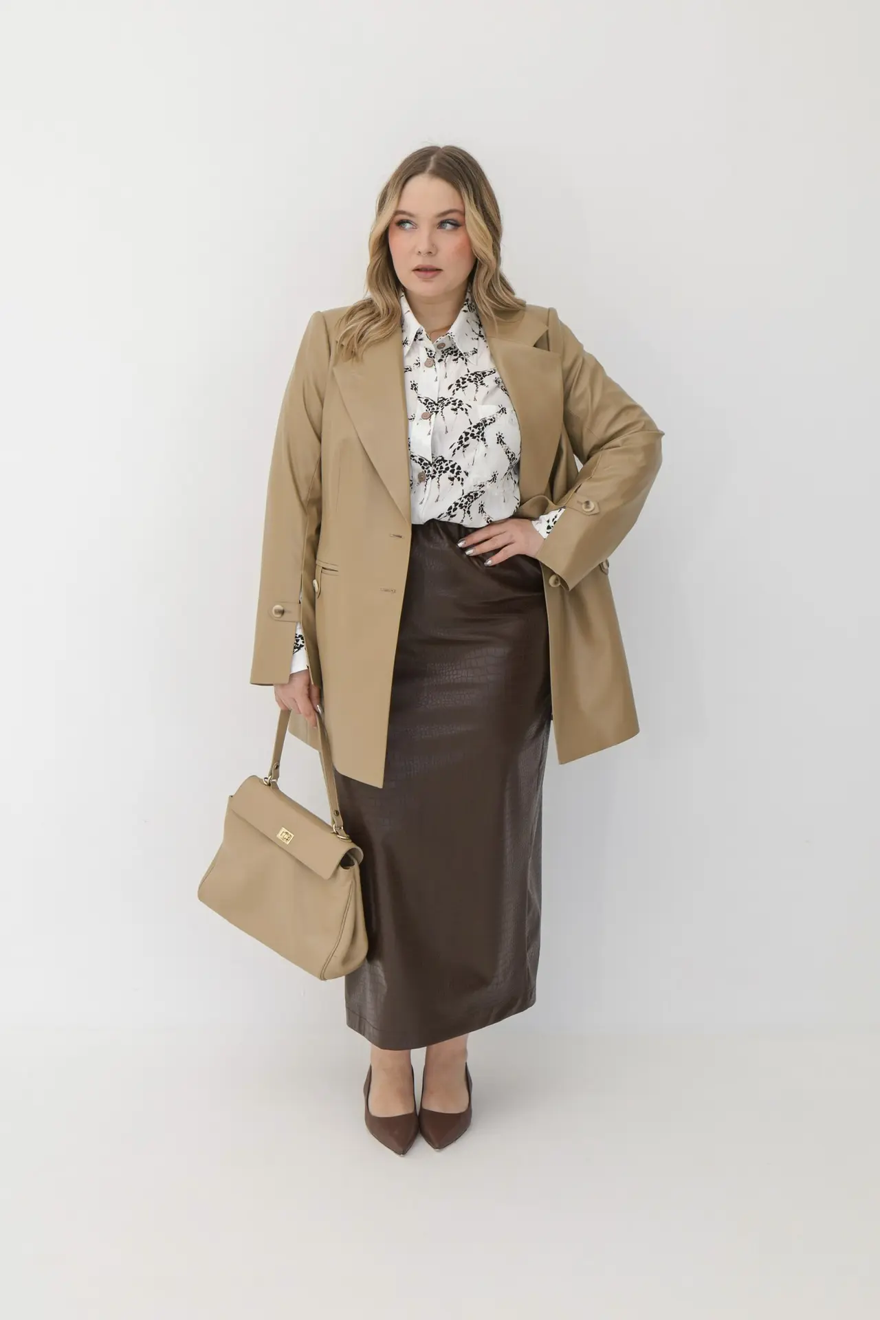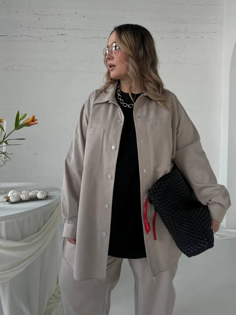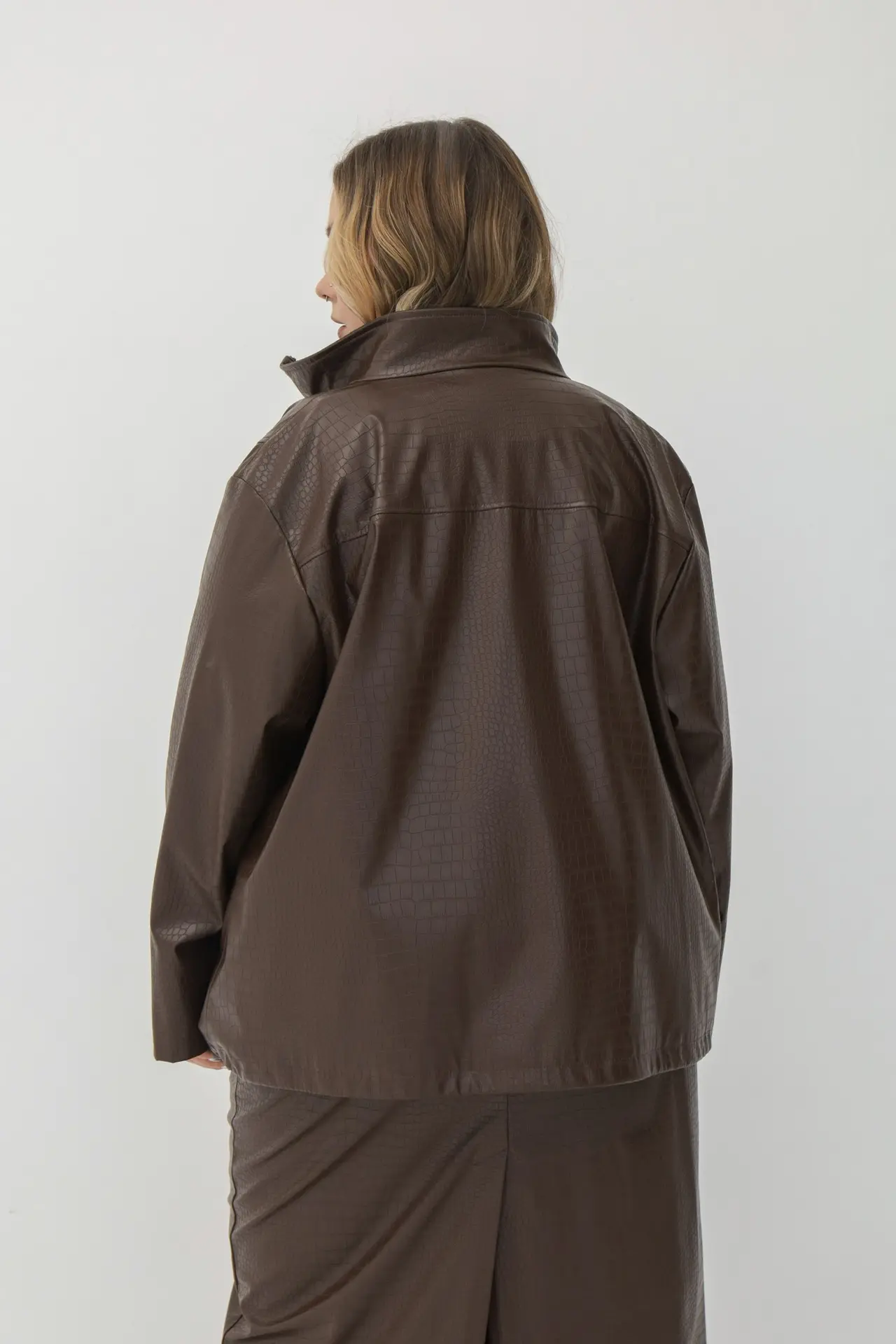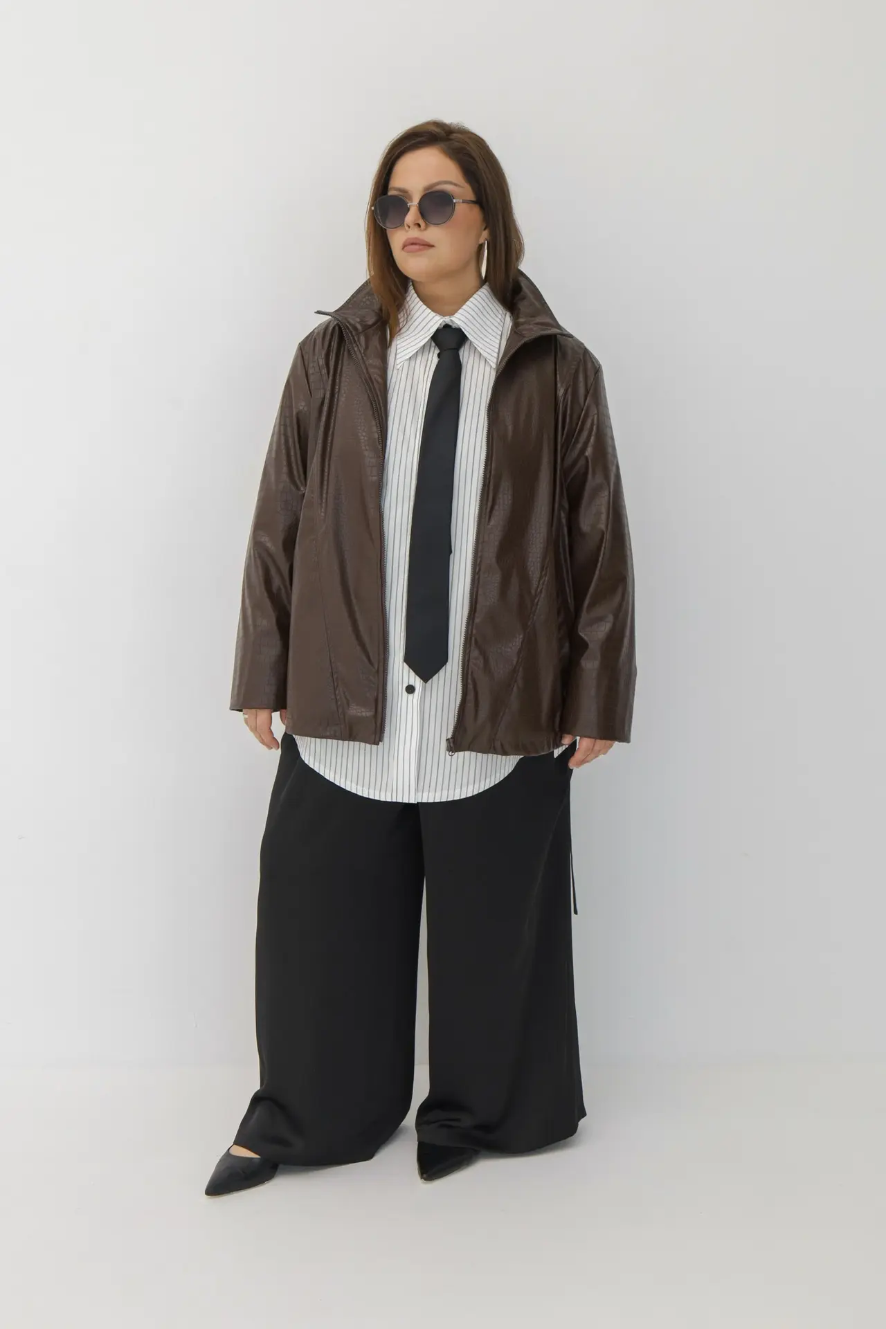 Костюм из экокожи можно носить комплектом или разбирать на образы. Куртка добавляет мягкую динамику благодаря свободному силуэту и рукавам, а юбка создаёт спокойную, вытянутую линию.