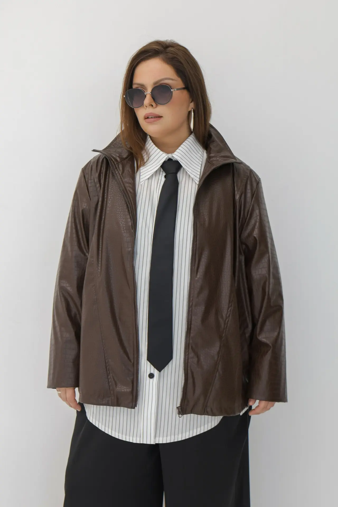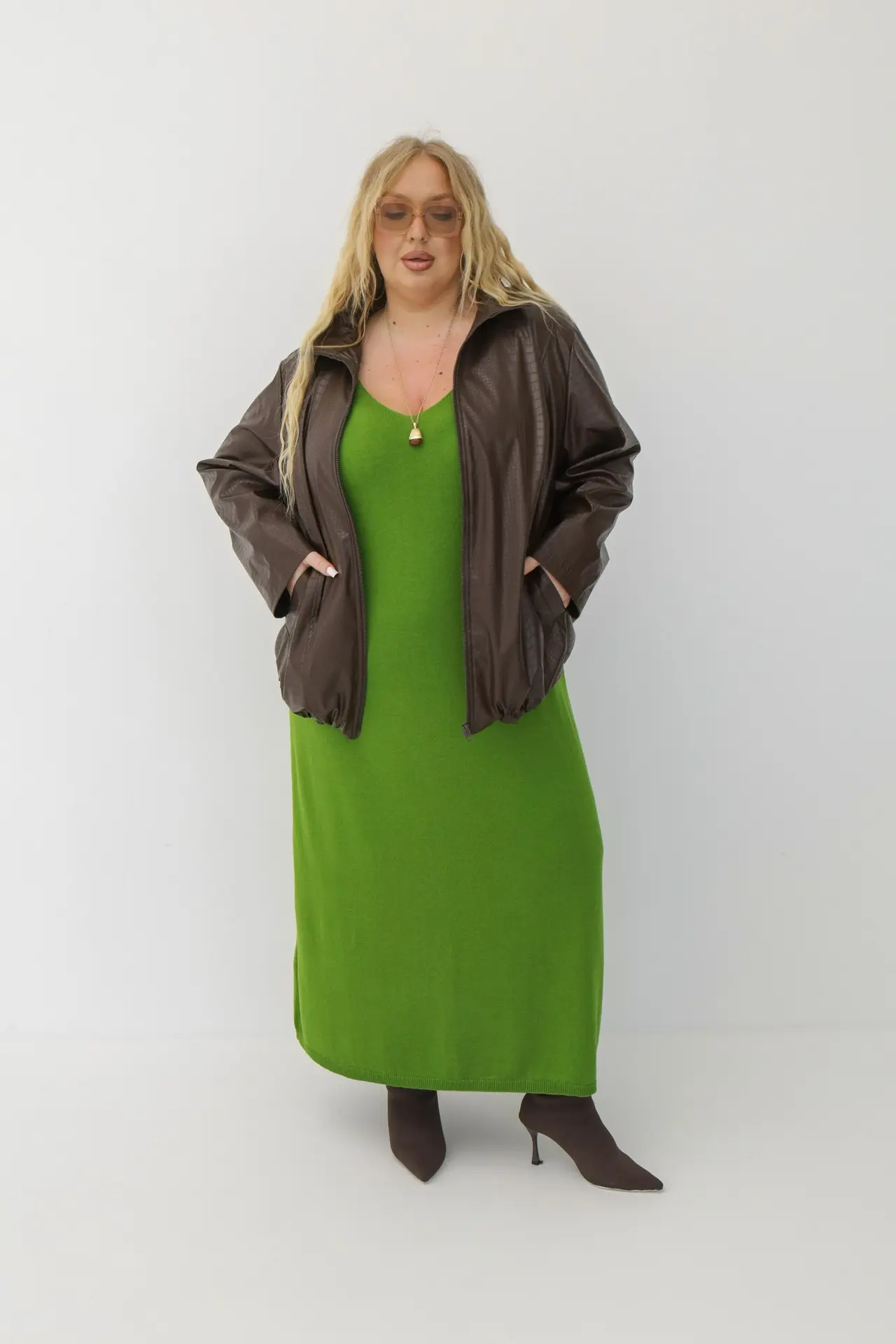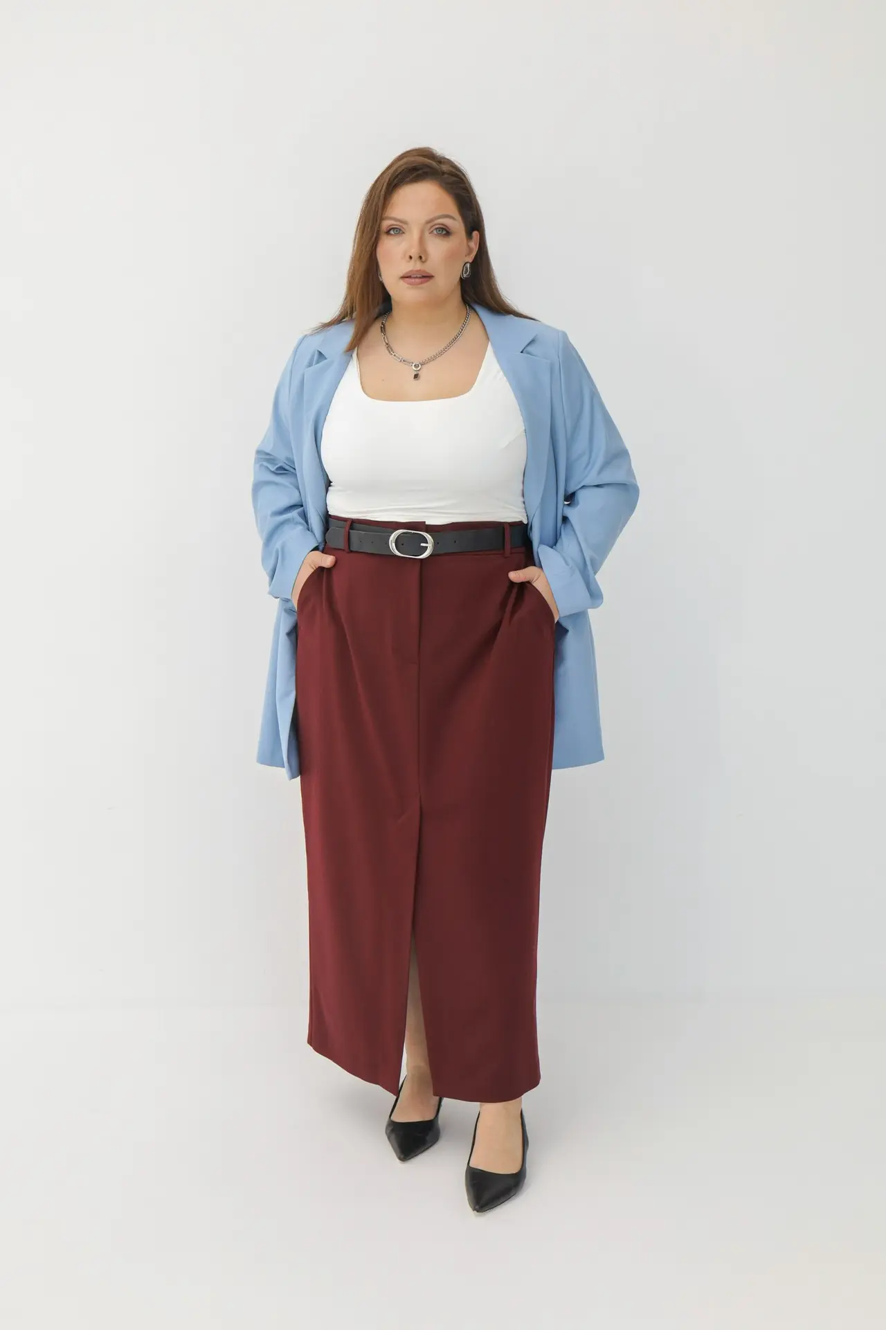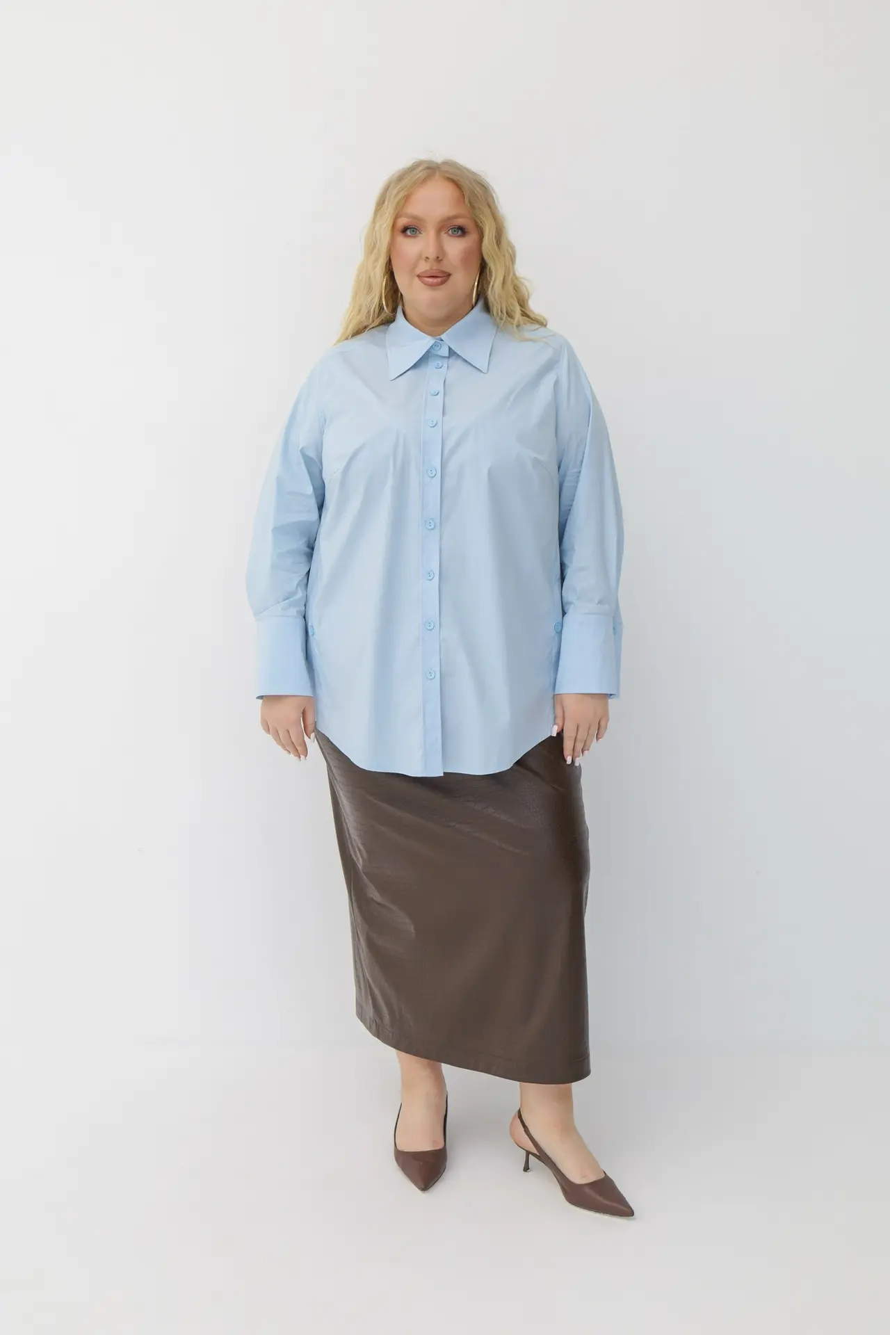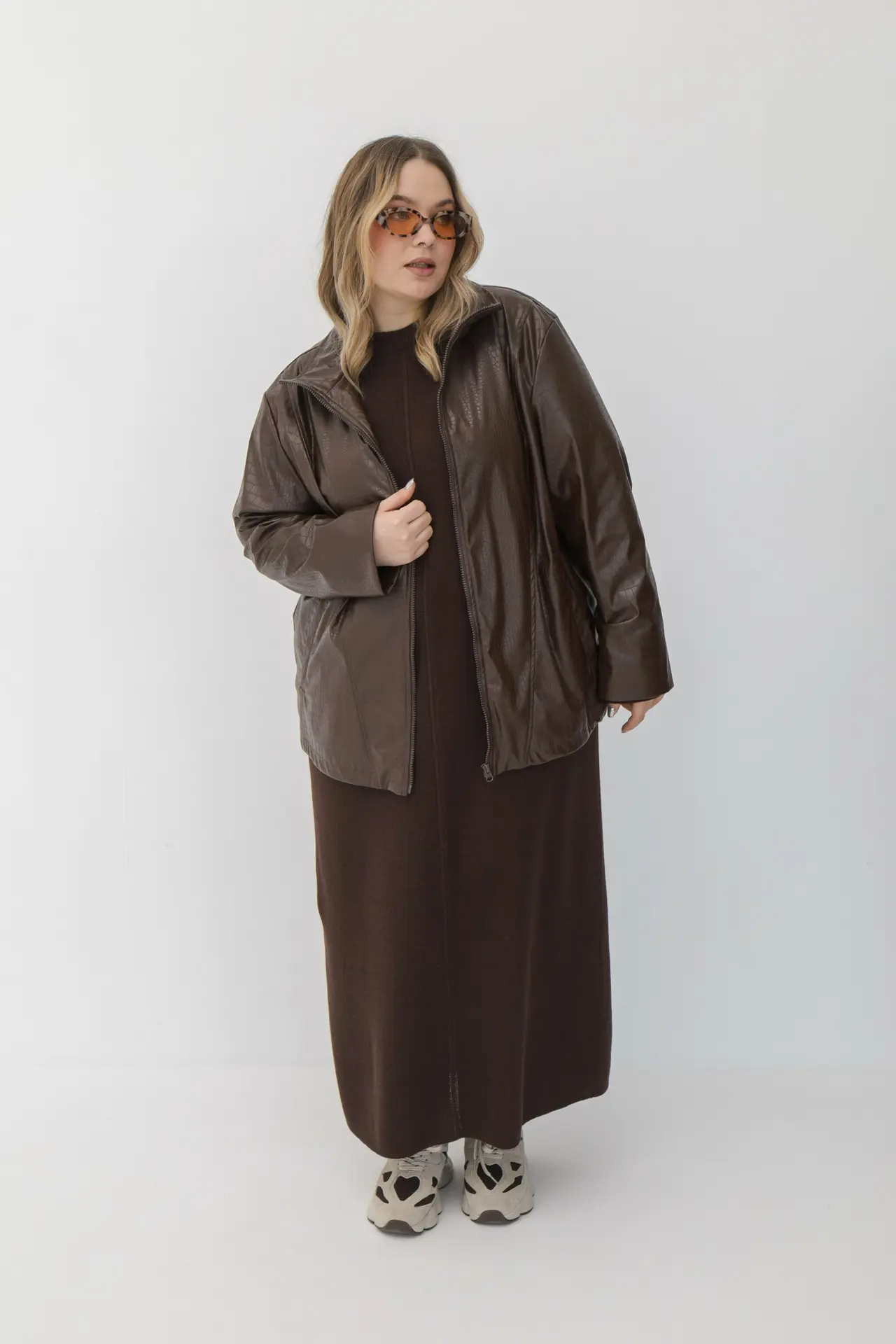 Костюм из экокожи можно носить комплектом или разбирать на образы. Куртка добавляет мягкую динамику благодаря свободному силуэту и рукавам, а юбка создаёт спокойную, вытянутую линию.