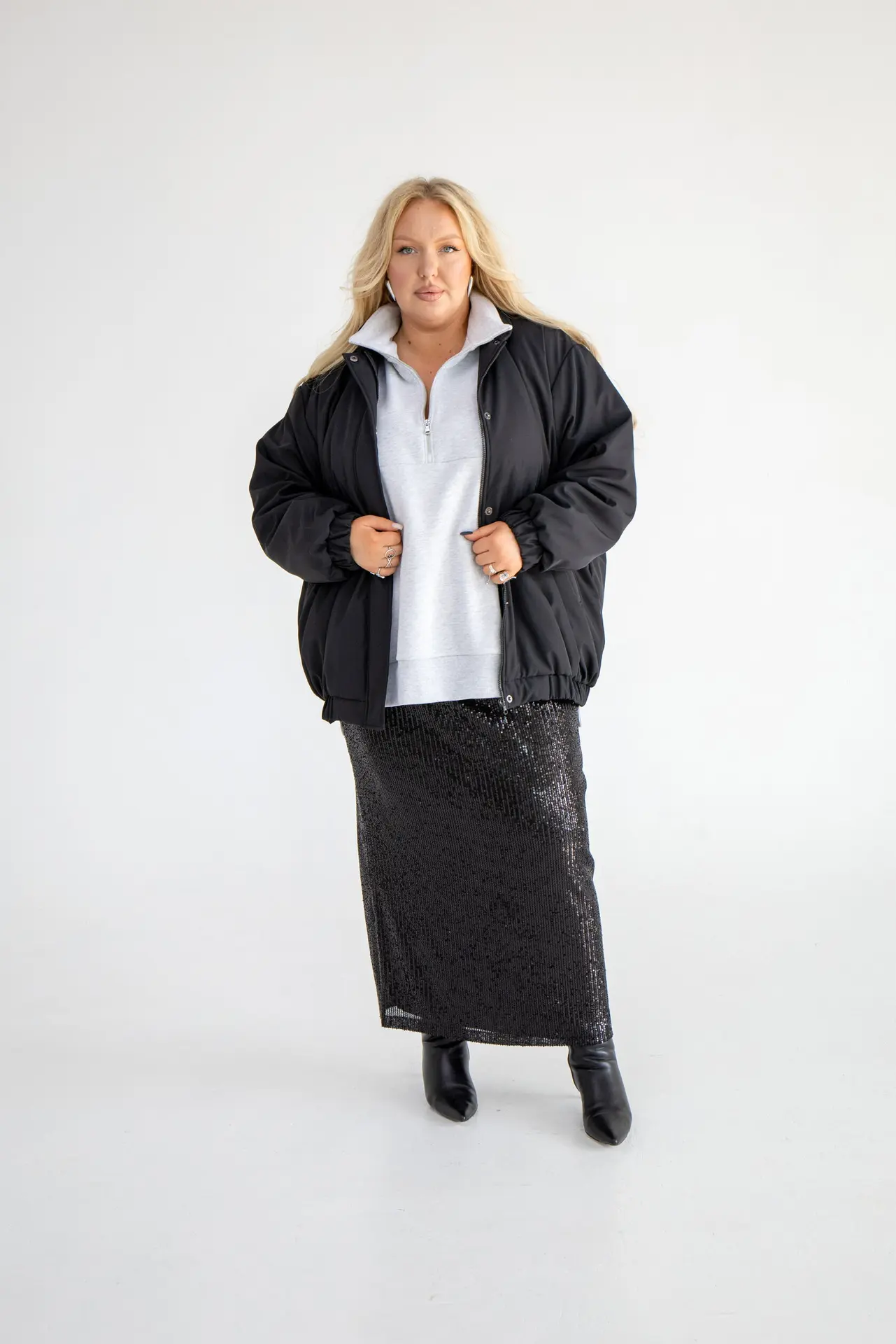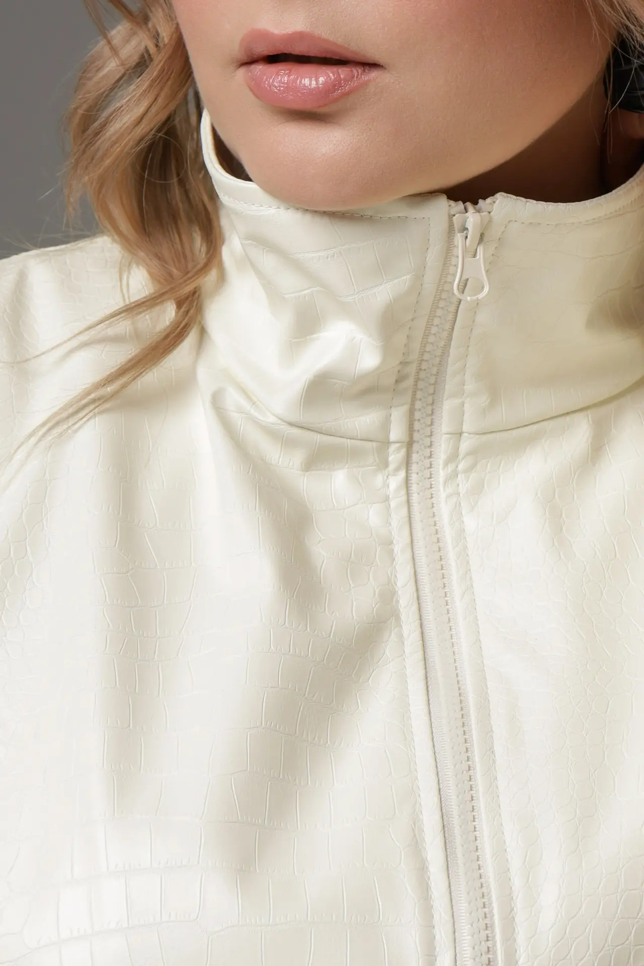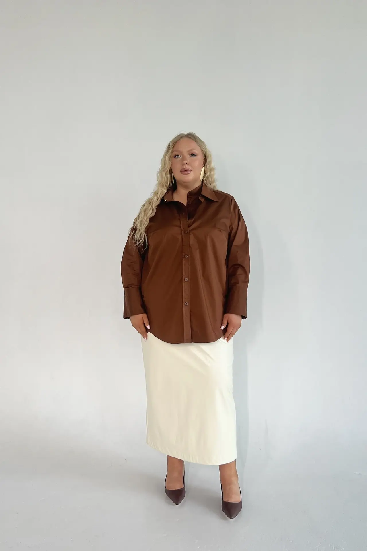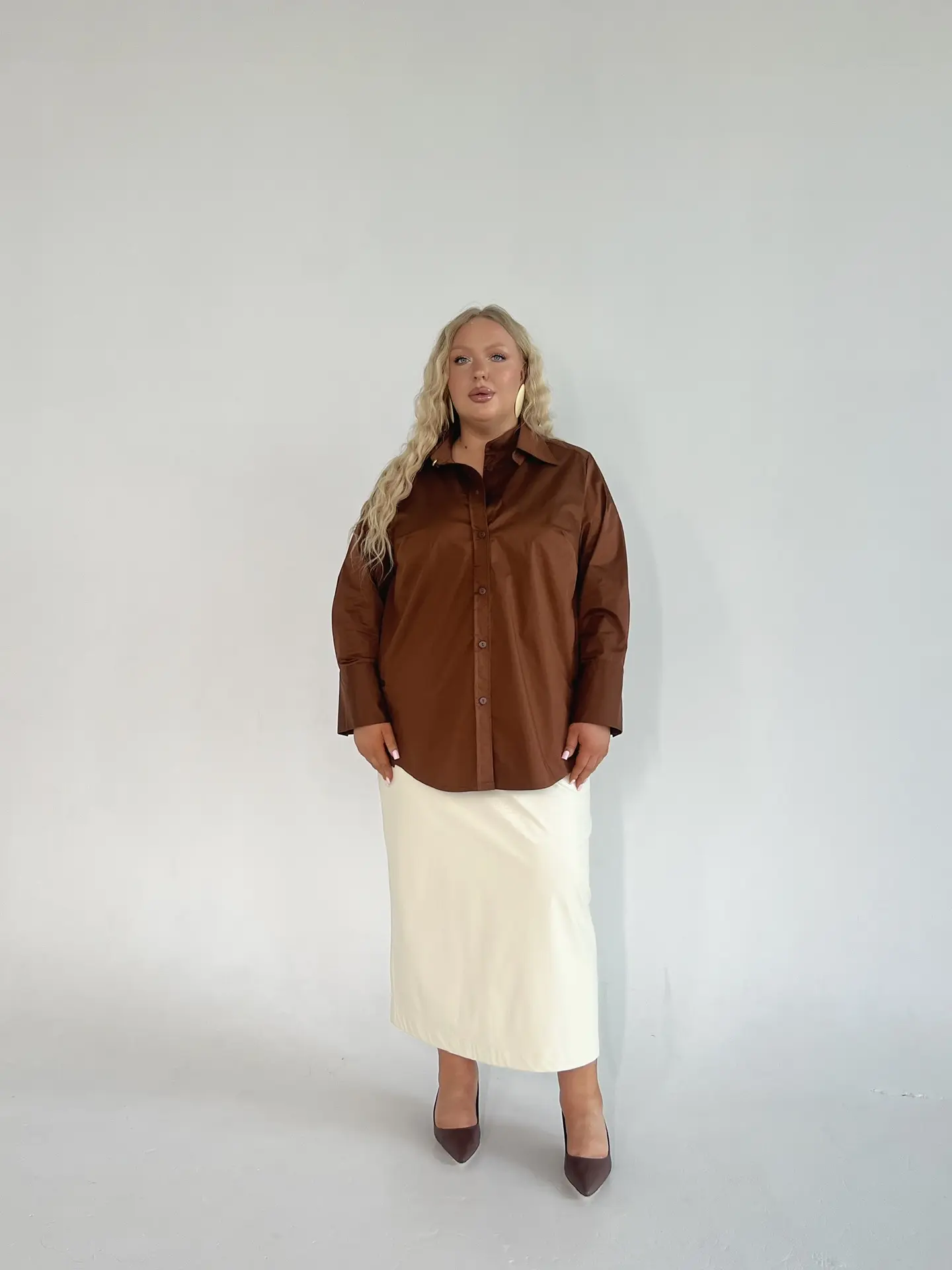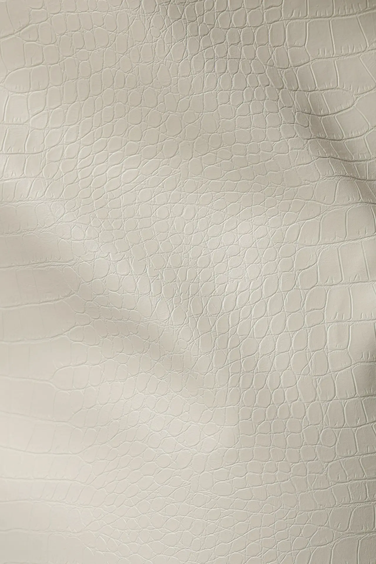 Костюм из экокожи можно носить комплектом или разбирать на образы. Куртка добавляет мягкую динамику благодаря свободному силуэту и рукавам, а юбка создаёт спокойную, вытянутую линию.