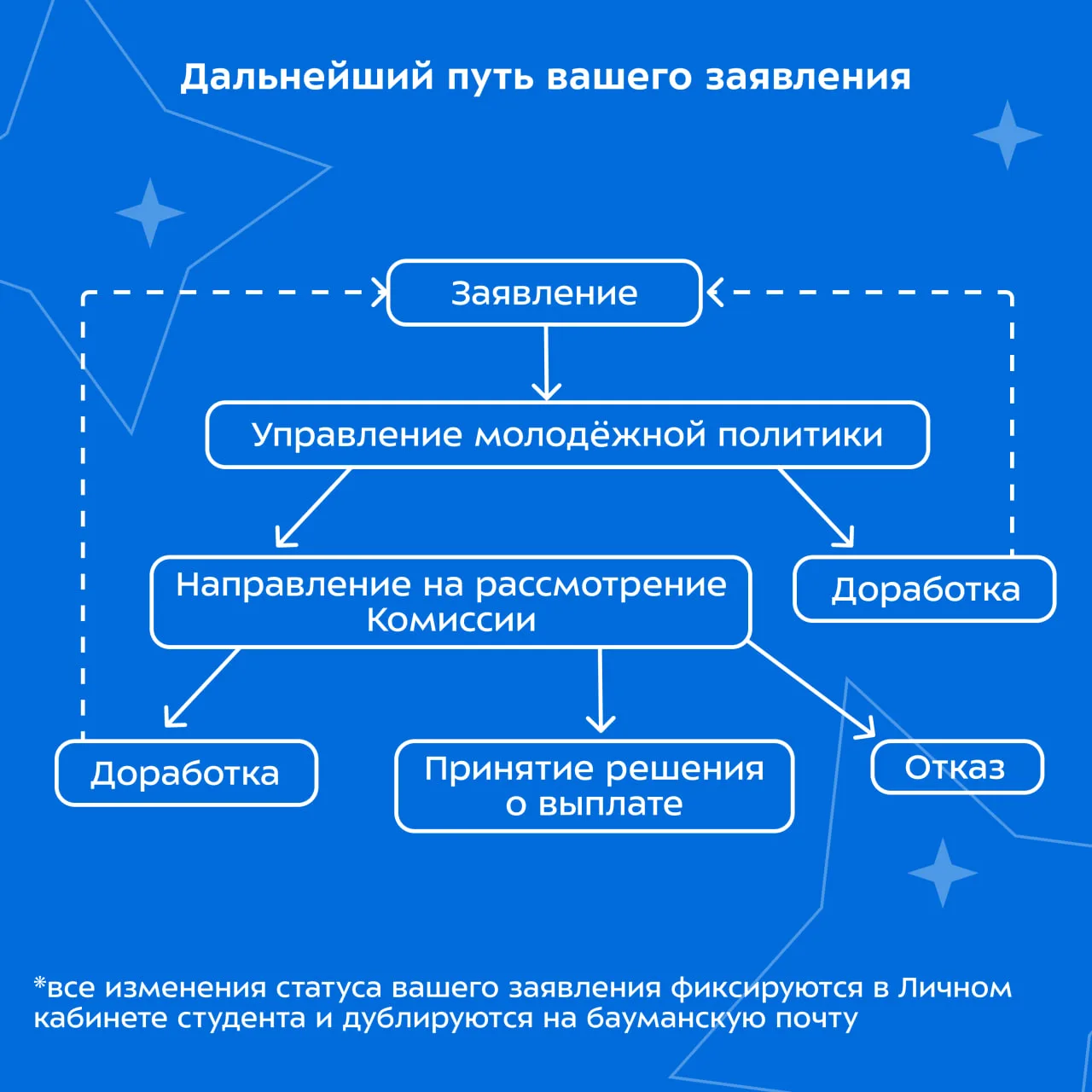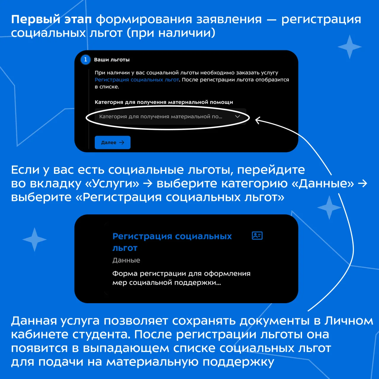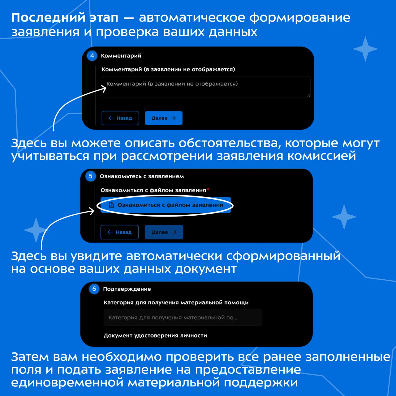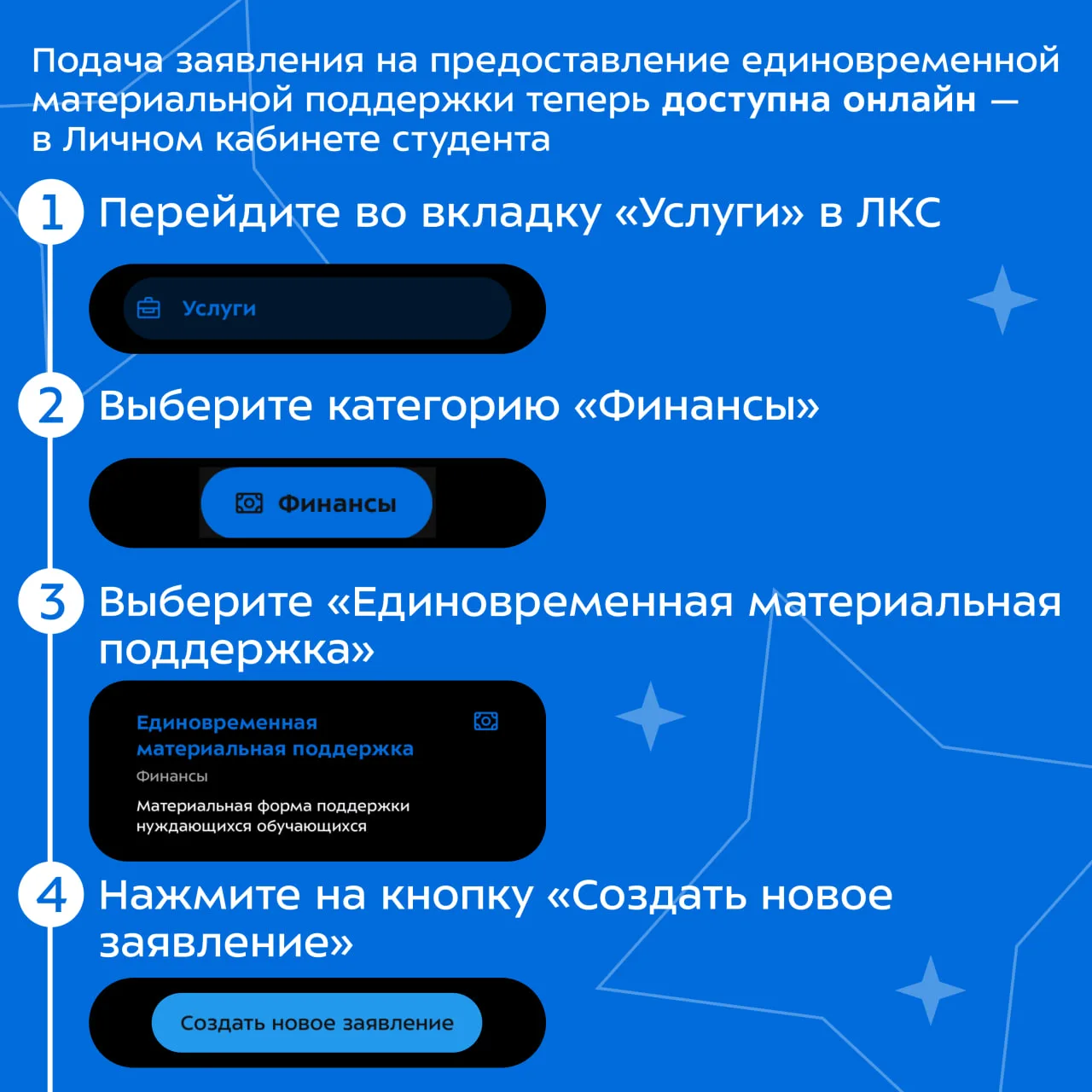 🏁 Поддержка предоставляется на основании личного заявления обучающегося с указанием причин обращения. К заявлению необходимо приложить документы, подтверждающие необходимость получения помощи.