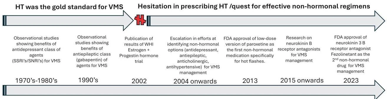 Обзор и хронология различных фармакологических препаратов, показавших эффективность в отношении вазомоторных симптомов в репродуктивном старении
