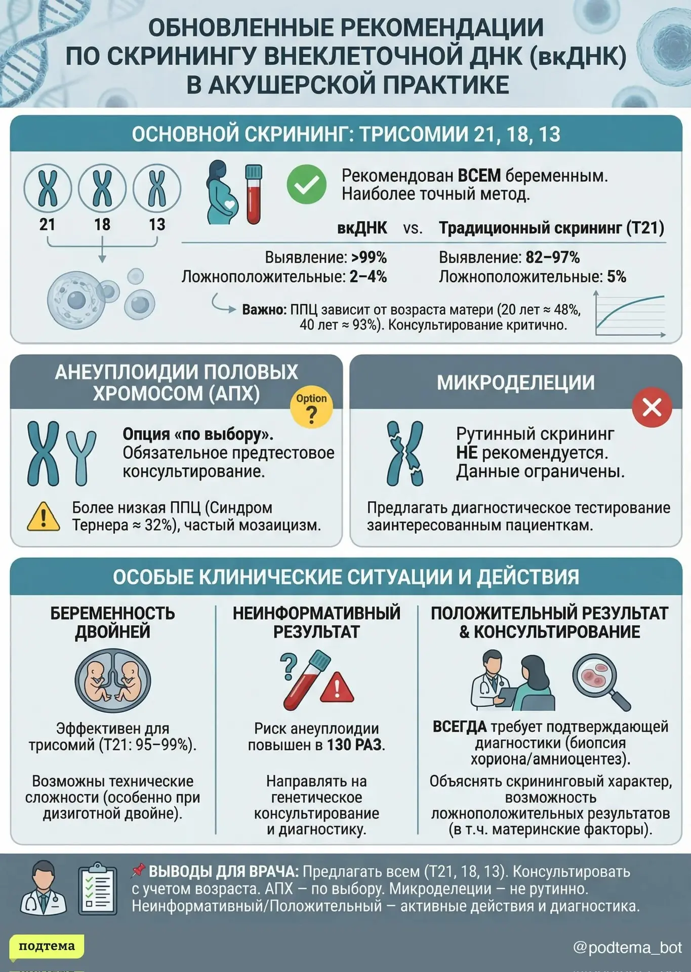 7. Предтестовое консультирование обязательно — пациентки должны понимать, что НИПТ является скринингом, а не диагностикой, и имеют право выбора объема тестирования