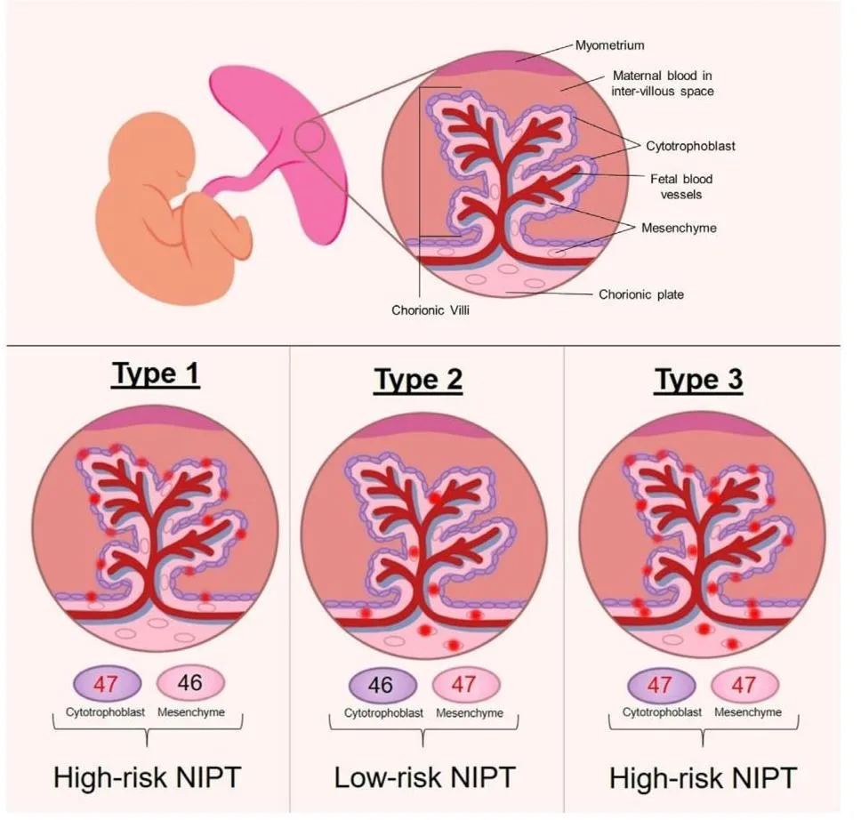 НИПТ изучает генетический материал, исходящий из трофобласта плаценты. Поэтому если НИПТ нашел аномалии, то это либо тип 1, либо тип 3