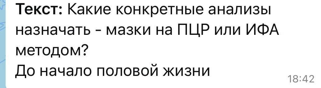 Чаще это выглядит так: взяли качественный ПЦР «на все и побольше» или Фемофлор, нашли гарднереллы или некоторое снижение лактобактерий и пошли «исцелять»