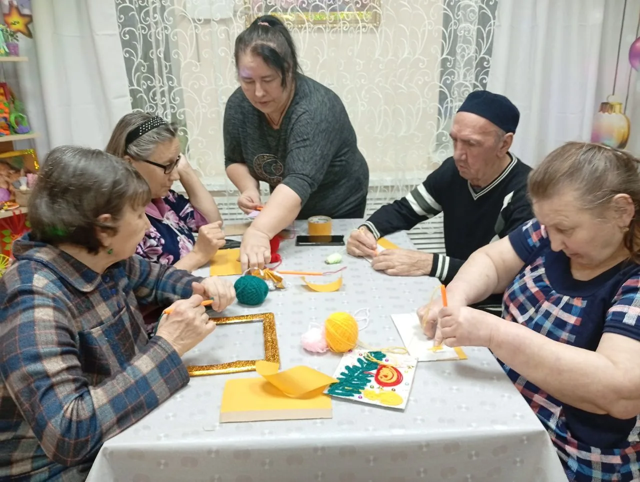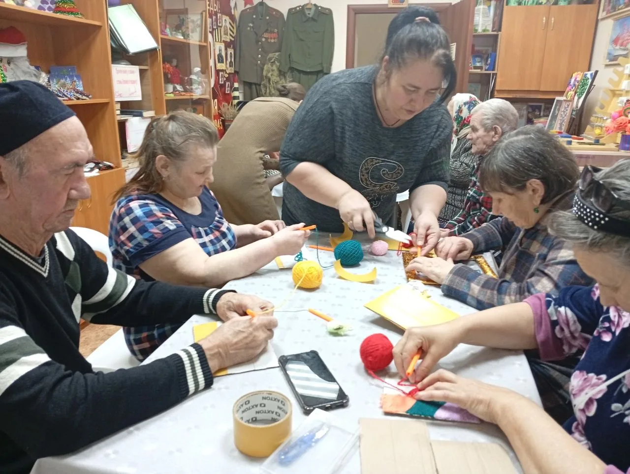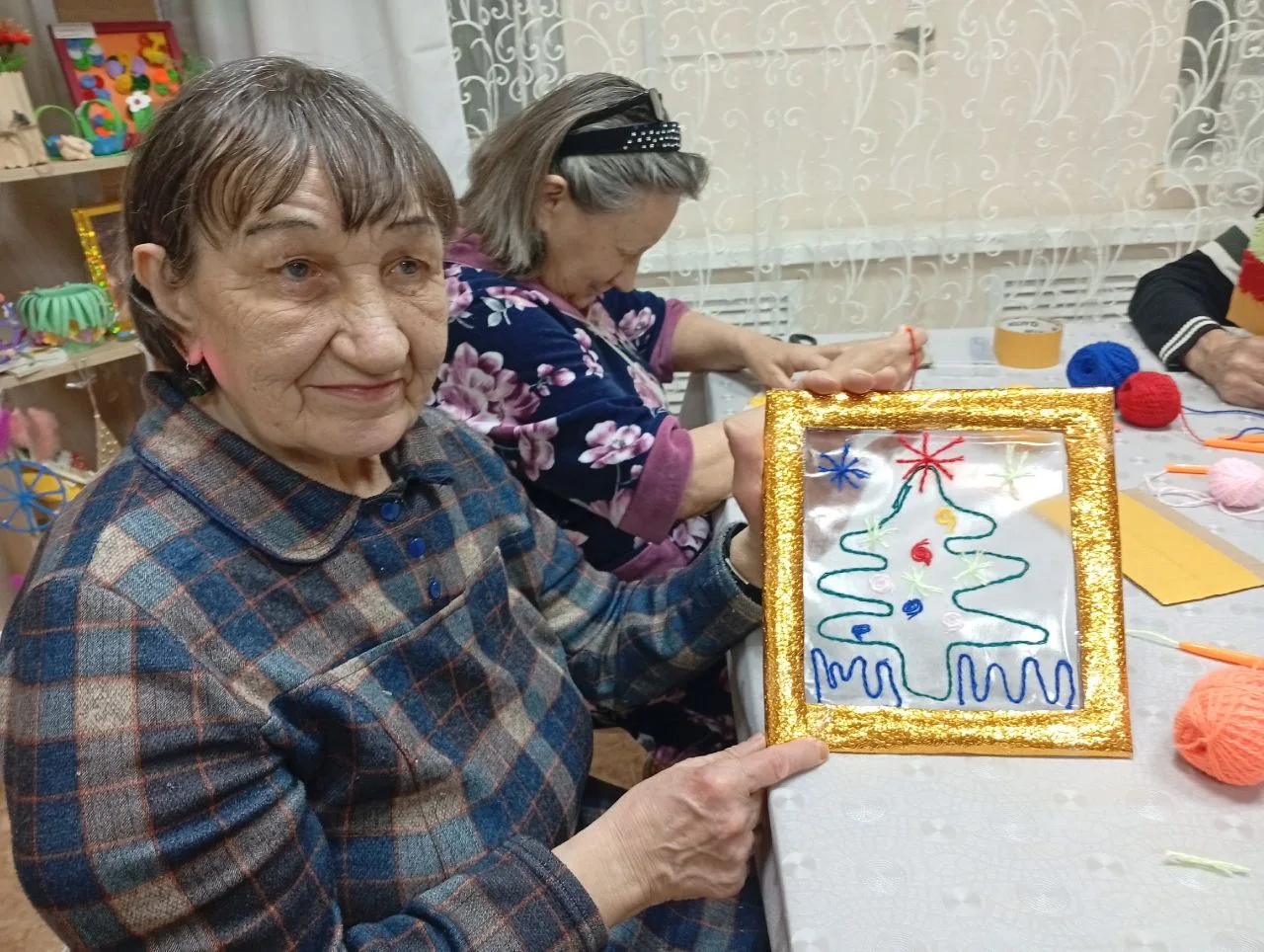 На занятии участники осваивали уникальную технику: создавали картины с помощью шерстяных нитей на липкой поверхности, предварительно нанеся карандашный эскиз. Этот вид творчества — не только способ проявить фантазию, но и эффективное упражнение для поддержания мелкой моторики, концентрации внимания, что служит отличной профилактикой возрастных изменений.