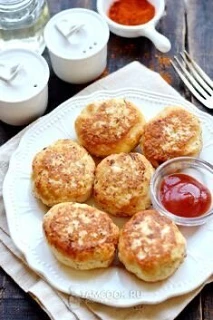 1. Смешиваем творог, 1 яйцо, сыр, муку, щепотку сахара и соли. Формируем овальные биточки.