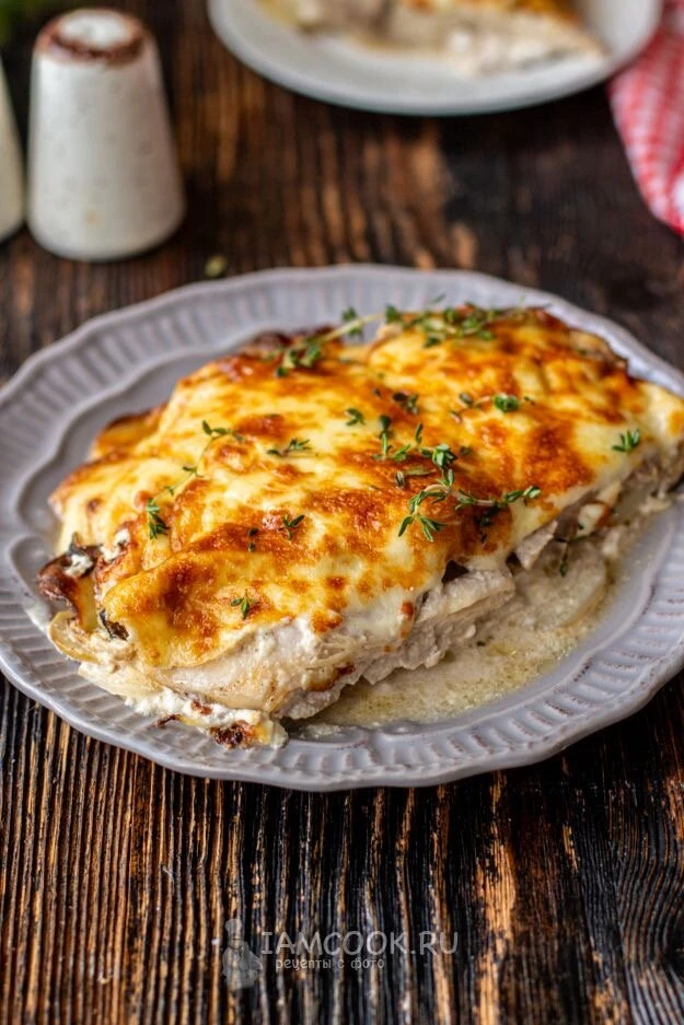 2. Куриное филе хорошо отбиваем и кладем поверх картошки, посыпаем солью, перцем и приправой для курицы и покрываем хорошим слоем майонеза.