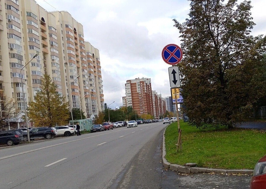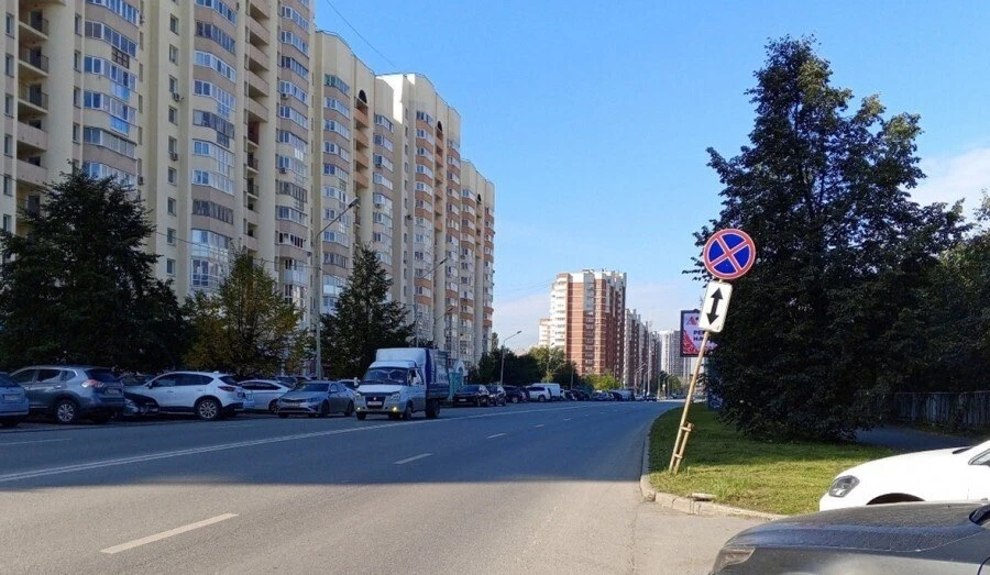 Покосившийся дорожный знак «Остановка запрещена» был выявлен на газоне вблизи здания по адресу: ул. Академика Шварца, 17.