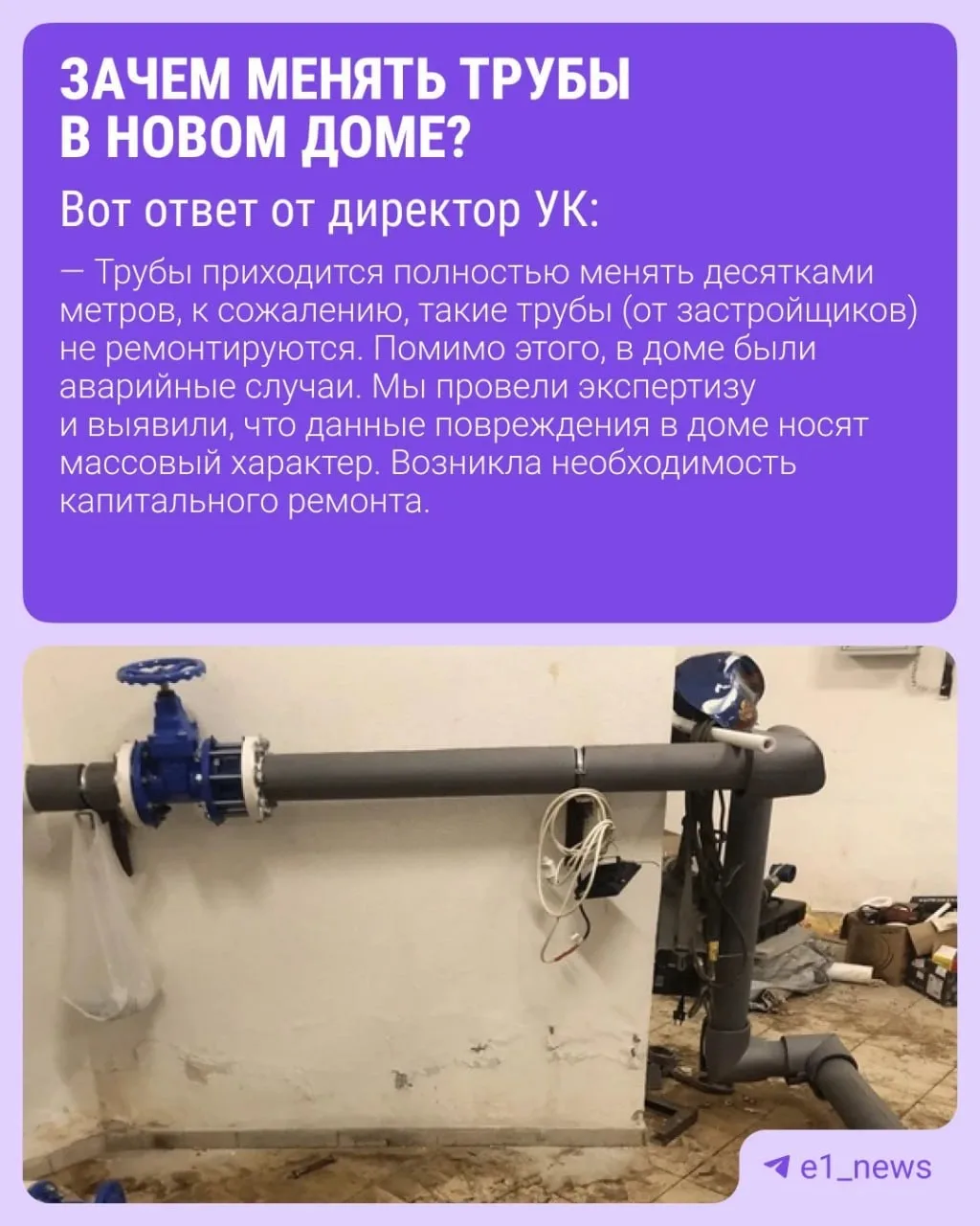 По словам жильцов, на новых трубах уже есть протечки. После монтажа появились проблемы с пожарным краном, в случае возгорания спасатели не смогут подключиться к системе водоснабжения дома и им придется искать другой источник воды.