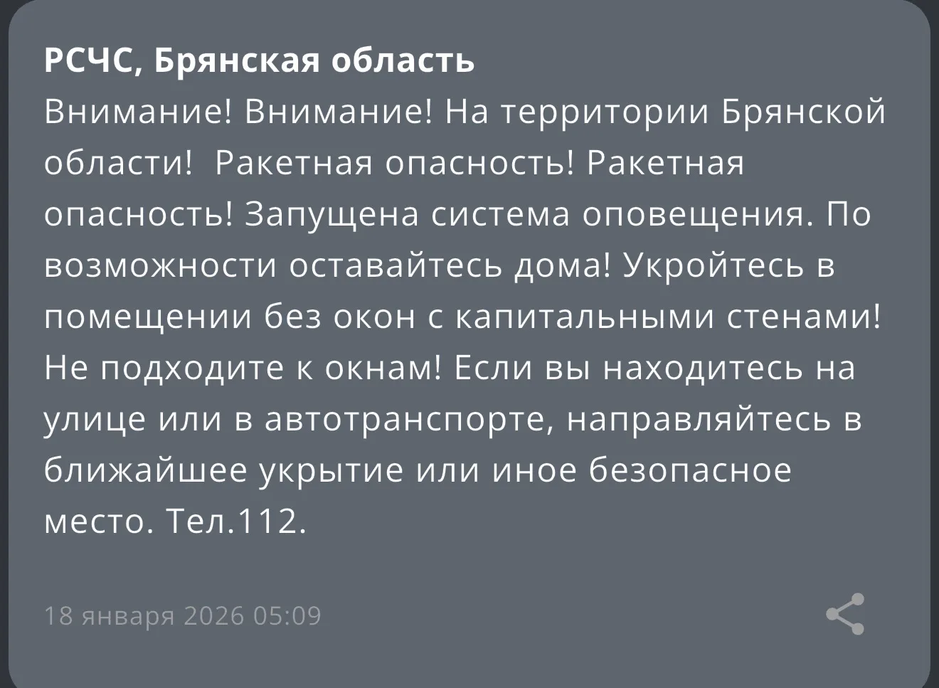 Жителей Брянской области ночью поднял с постелей сигнал системы оповещения. В 5:09 по местному времени в регионе была объявлена «ракетная опасность».