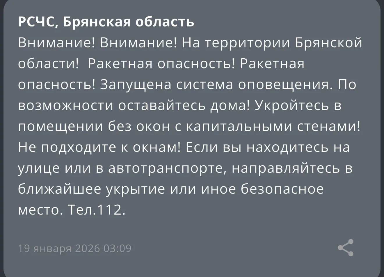 Жителей Брянской области ночью поднял с постелей сигнал системы оповещения. В 3:09 по местному времени в регионе была объявлена «ракетная опасность».