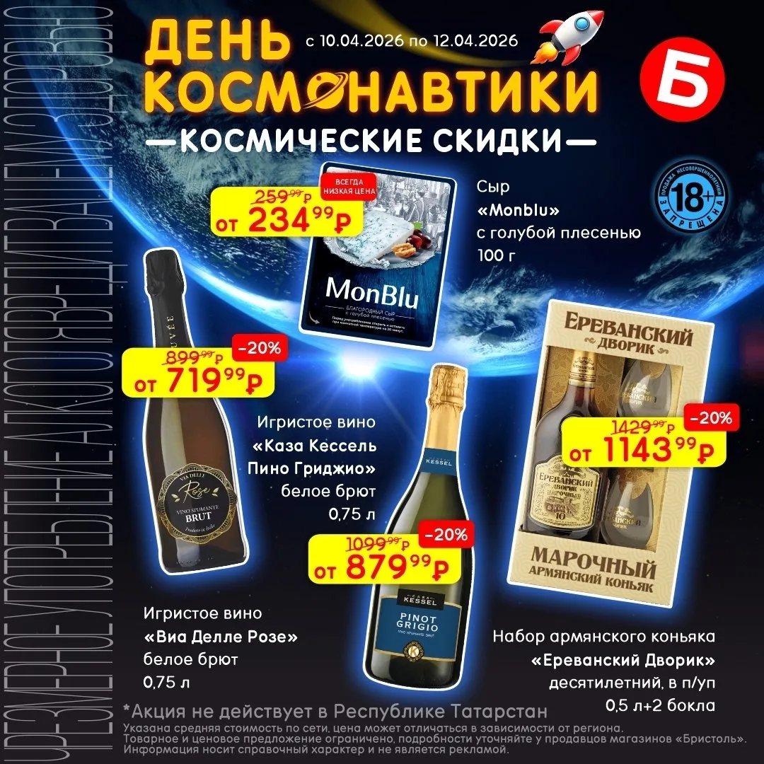 с 10 по 12 апреля совершай покупки по "Космическим скидкам" на вина 🍷 и коньяк 🥃
