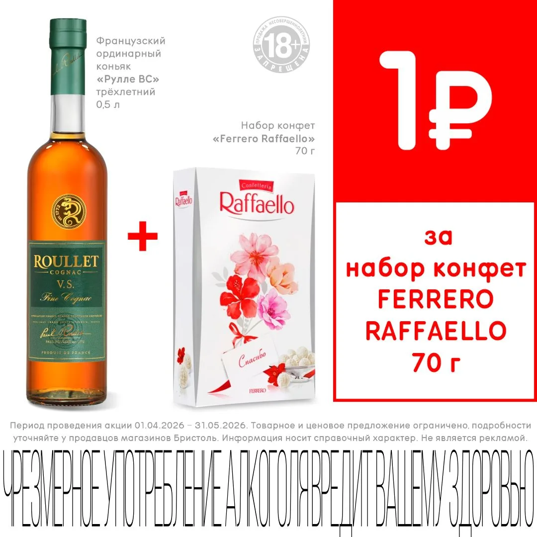 Классическое сочетание: при покупке коньяка РУЛЛЕ ВС 3 года 0,5л, набор конфет FERRERO RAFFAELLO 70г за 1₽