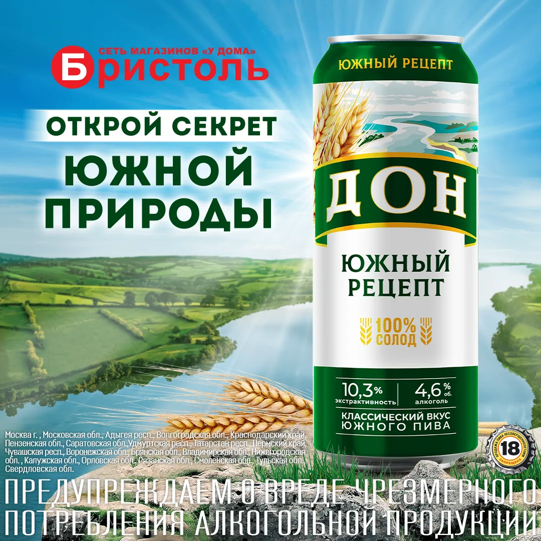 Дон Южный Рецепт 🍺Светлый фильтрованный лагер из натуральных ингредиентов и 100% солода 🌾 раскрывается ярким ароматом и мягким бархатистым вкусом.