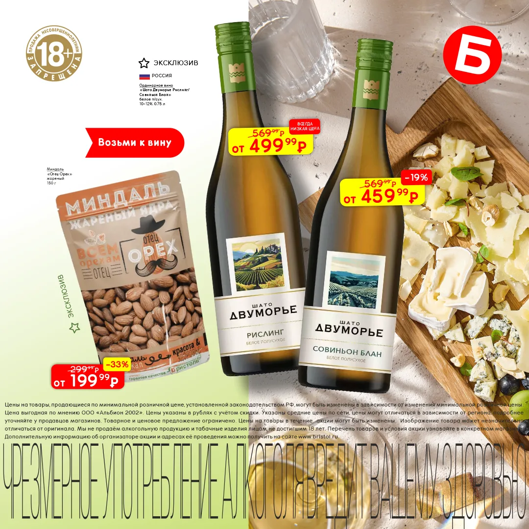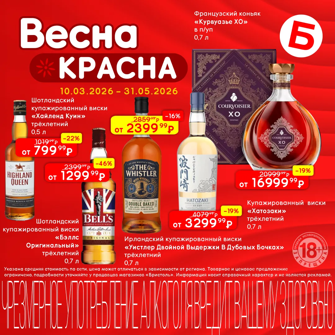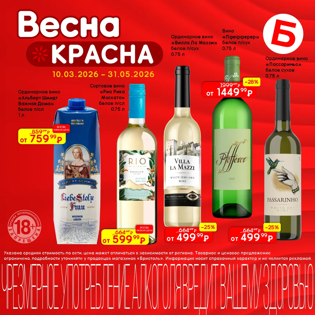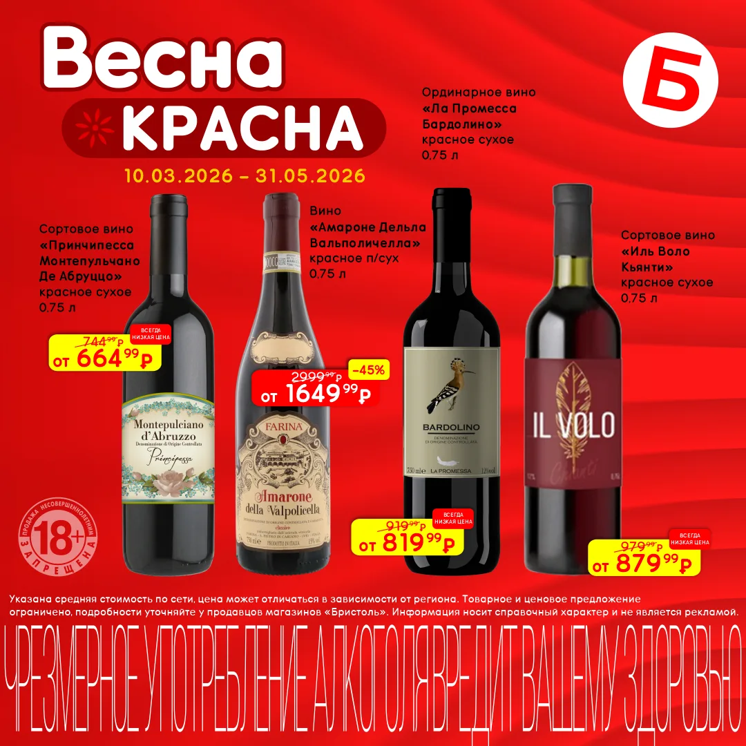 Цените хорошие вина и качественный шоколад? 💥 Тогда не пропустите акцию «Весна красна» в магазинах Бристоль. Скидки на вина до 25%, на шоколадные конфеты до 48%