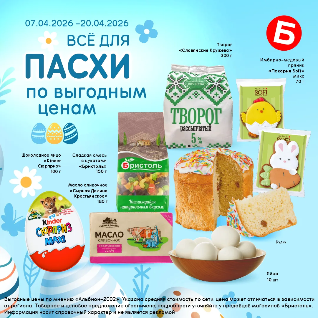 День космонавтики и Пасха выпали на один день 🚀🐣 Кто-то смотрит на звёзды 🔭, кто-то накрывает стол 🍰. А Бристоль объединяет тех, кто готовится к праздникам 🛒✨