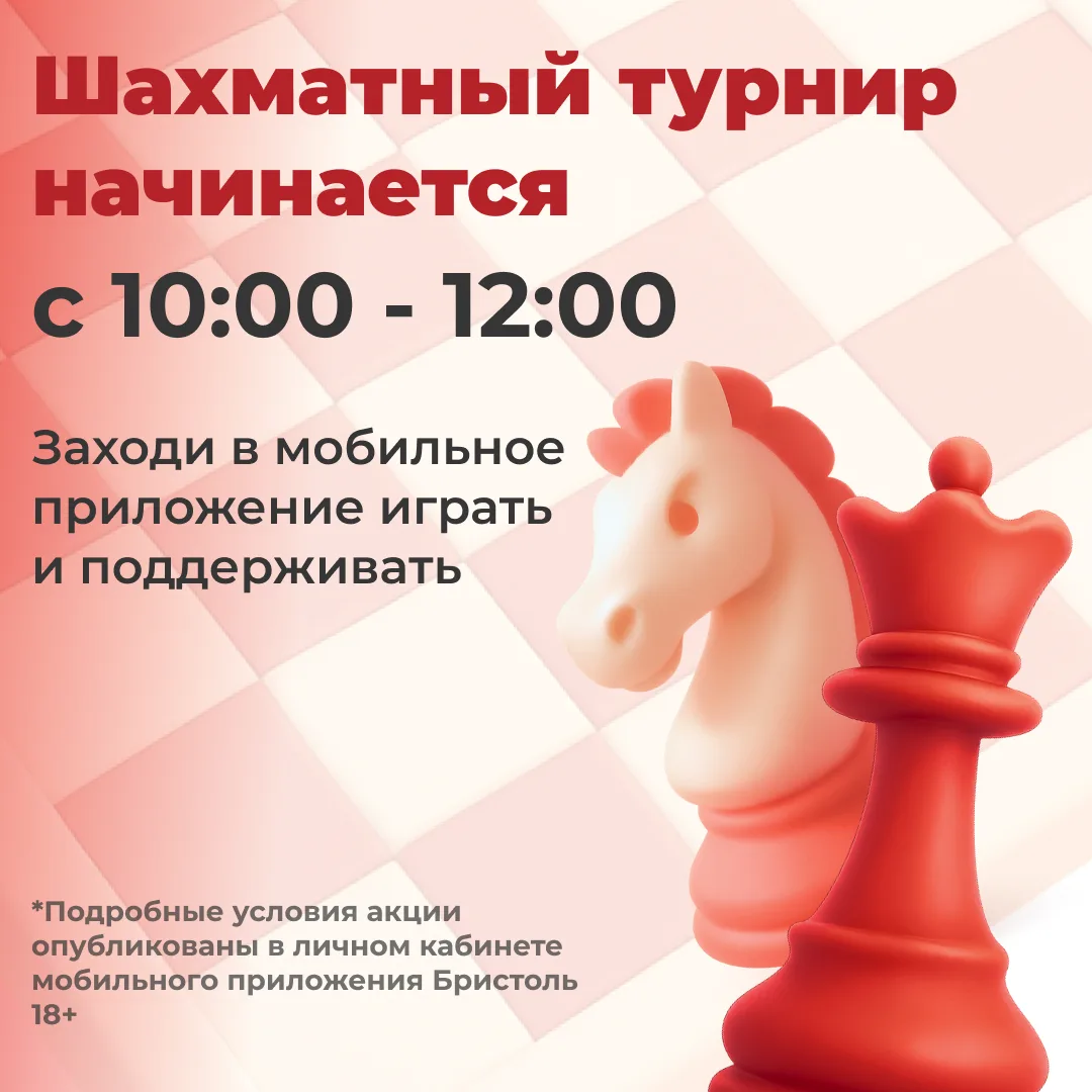 Сделай свой ход 🫵🏻 сегодня с 10 до 12 по МСК заходи в мобильное приложение Бристоль и обыгрывай всех в шахматном турнире♟
