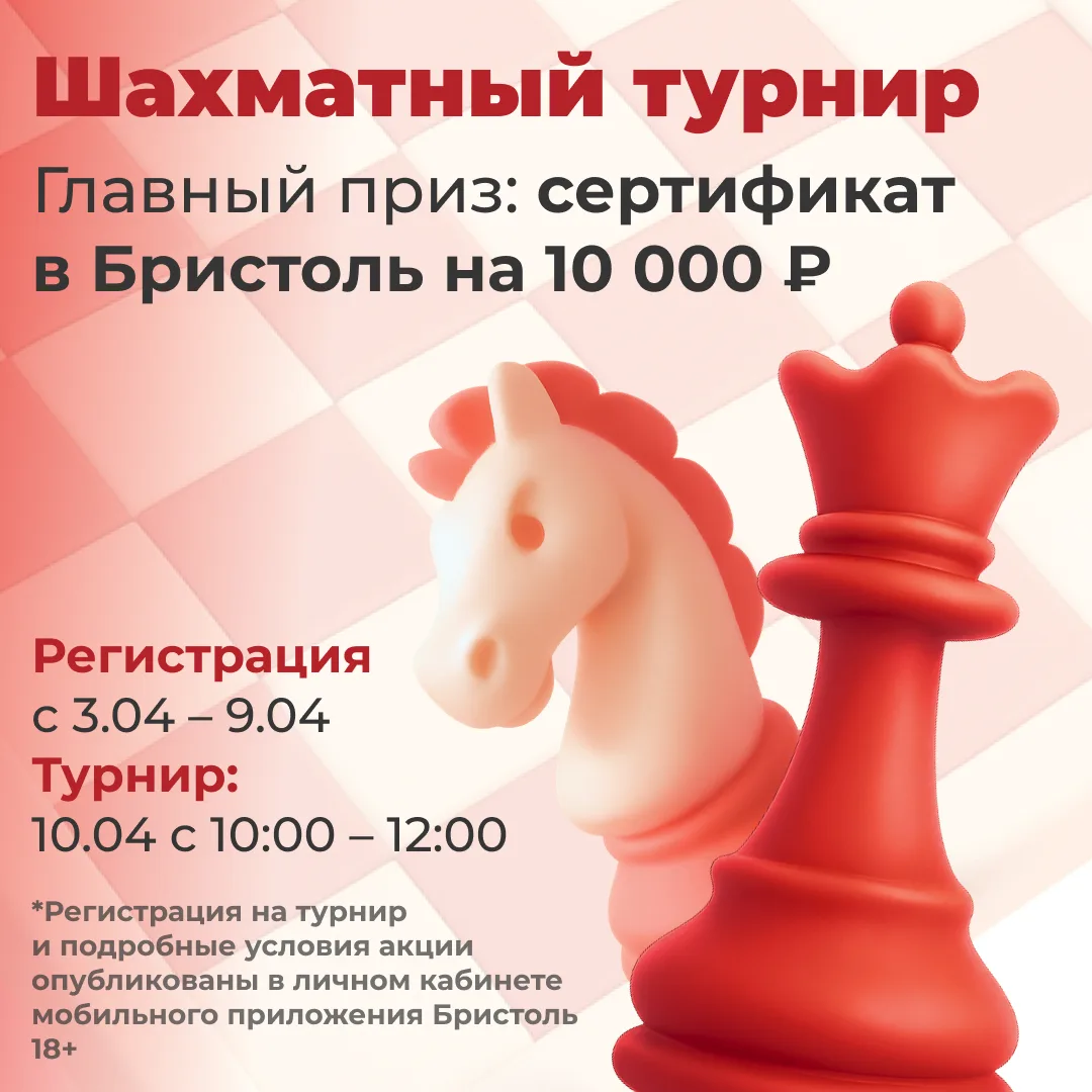 Тогда заходи мобильное приложение Бристоль с 3 по 9 апреля и регистрируйся в шахматном турнире