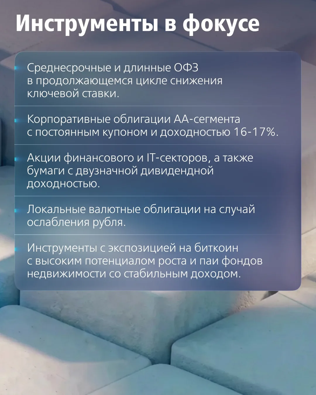 Эти инструменты позволяют получать фиксированный доход выше прогнозируемой инфляции. Если рыночные ставки продолжат падать, стоимость самих облигаций вырастет — это даст дополнительную доходность при продаже.
