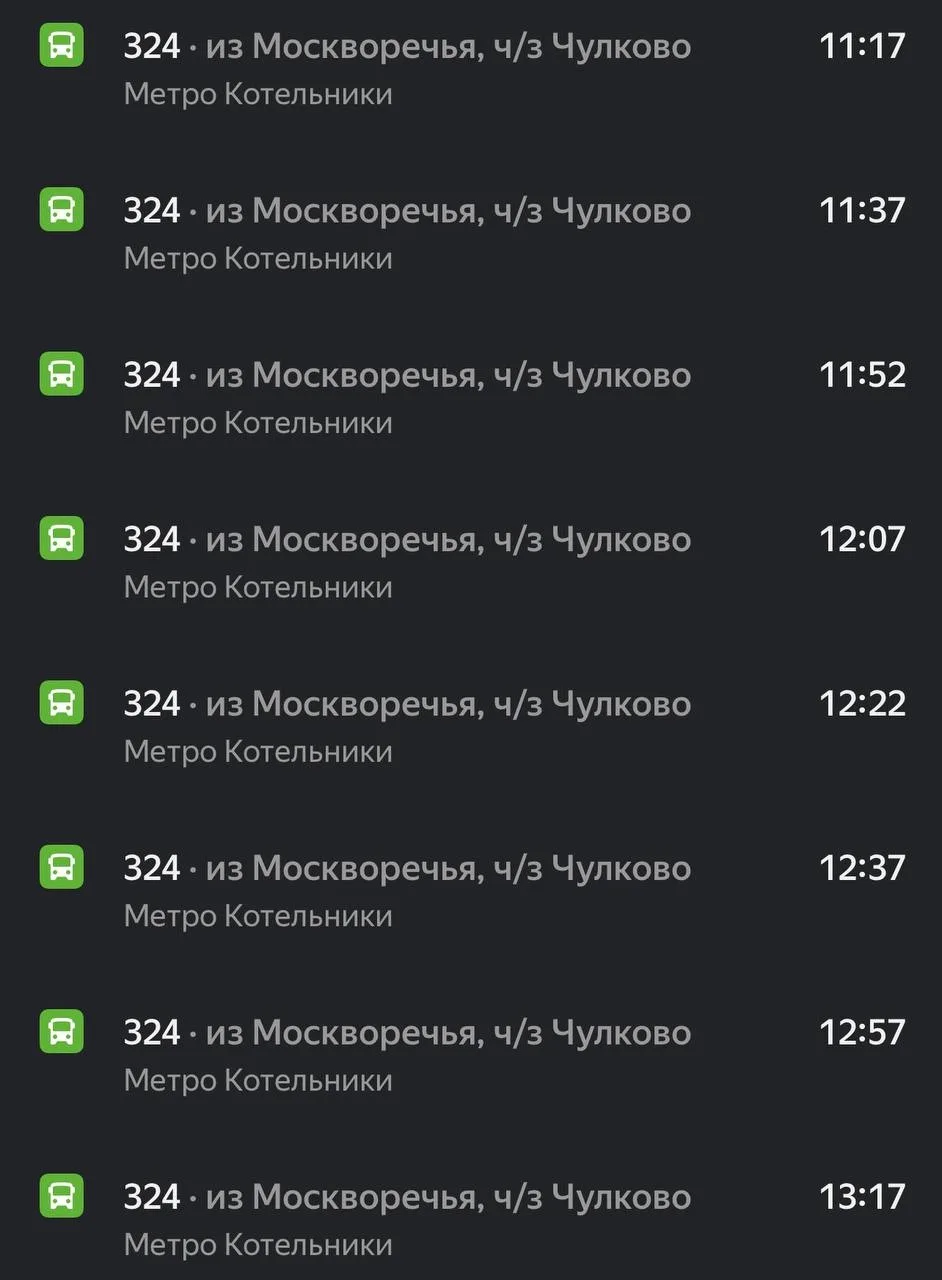— Здравствуйте! Вчера, в пятницу 20 февраля на остановке «Ивановка» в сторону Москвы не было автобуса 324 с 11:17 по 13:17. По расписанию, автобус должен был быть в 11:17, 11:37, 11:52, 12:07, 12:22, 12:37, 12:57, 13:17. В это же время всего 3 автобуса проехали из Москвы.