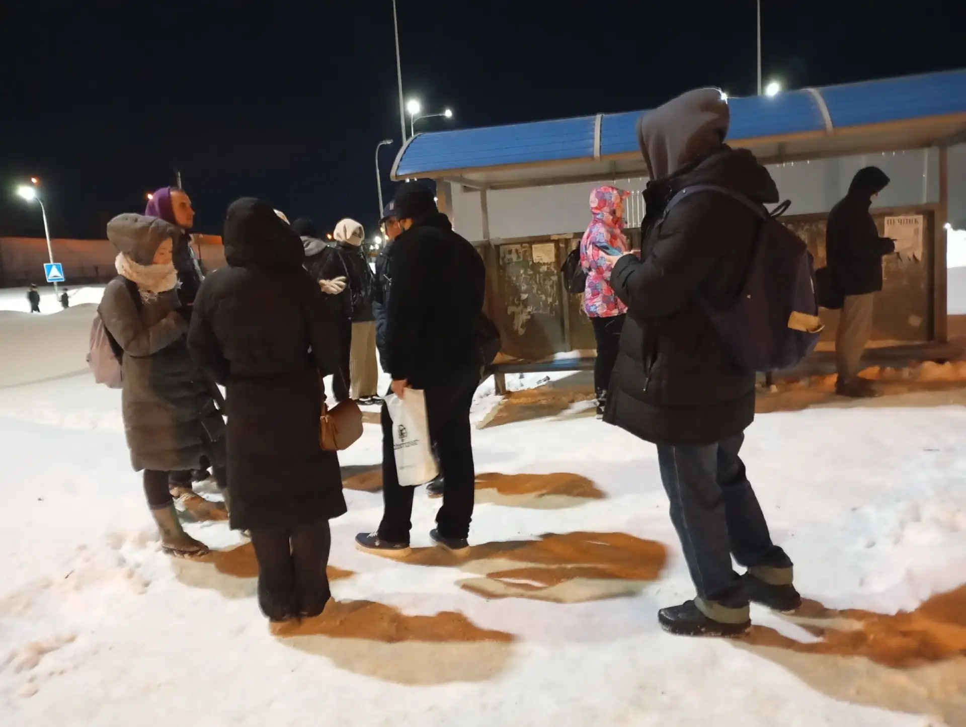 Толпы людей и длинные очереди образовались возле метро «Котельники» — люди пытаются уехать домой в метель.