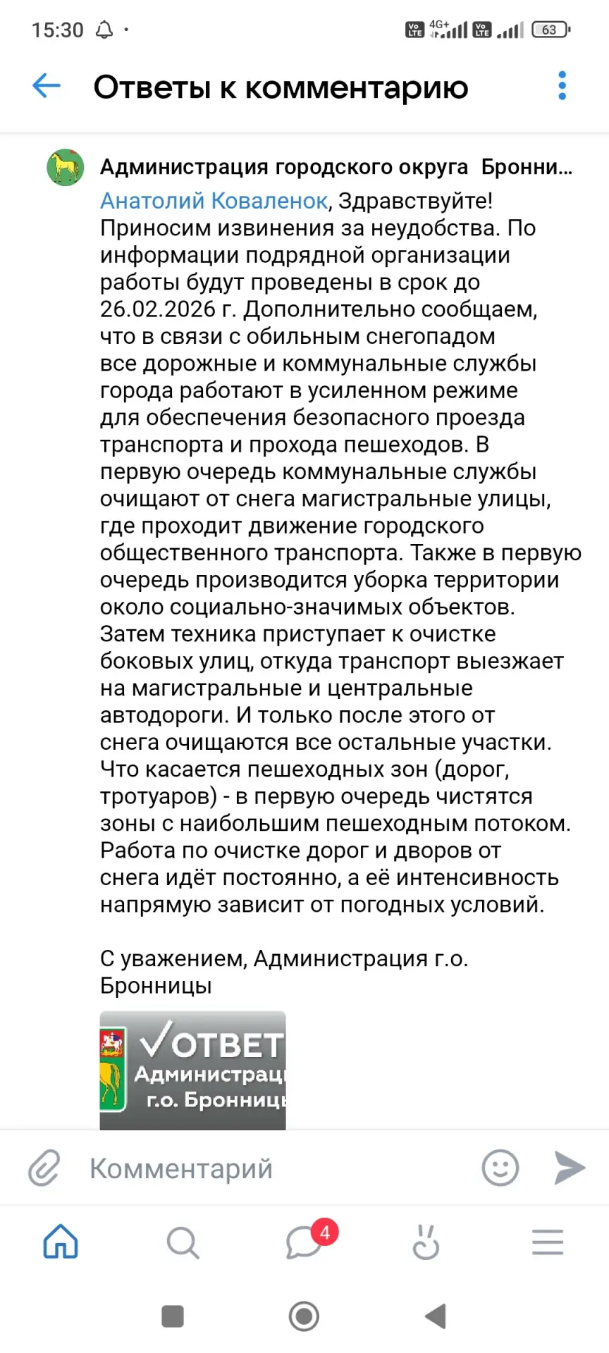 Что же, спасибо за ответ от администрации ГО Бронницы, по расчистке снега ул. Красная от полиции до её начала в сторону Москвы к 26 числу, но вот всего 22 февраля и пожарная машина застряла, скорые вроде пока не потребовались и я надеюсь что они не застрянут при экстренном вызове!
