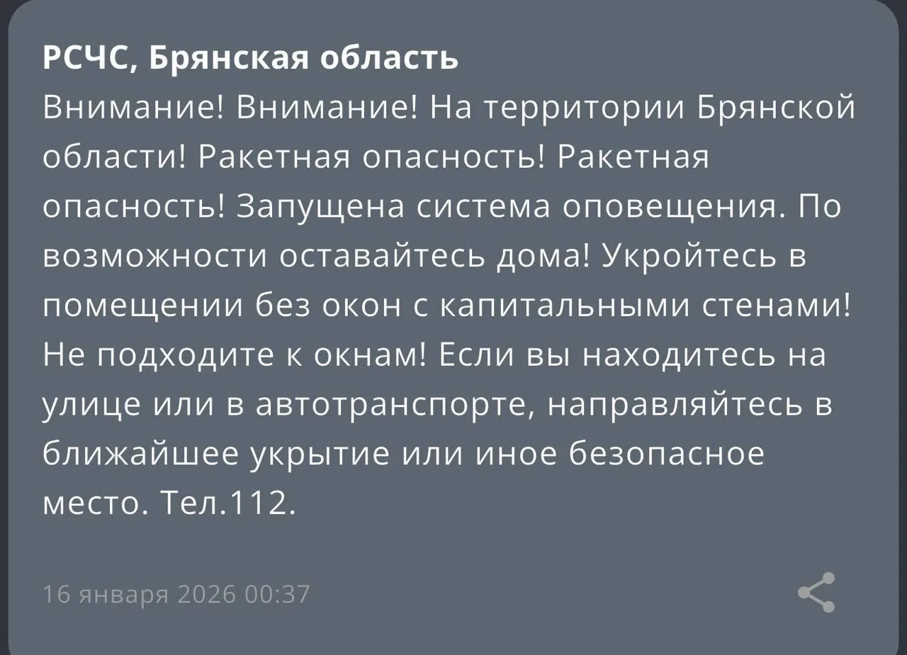 Внимание! Внимание! На территории Брянской области! Ракетная опасность! Ракетная опасность! Запущена система оповещения. По возможности оставайтесь дома! Укройтесь в помещении без окон с капитальными стенами! Не подходите к окнам! Если вы находитесь на улице или в автотранспорте, направляйтесь в ближайшее укрытие или иное безопасное место. Тел.112.