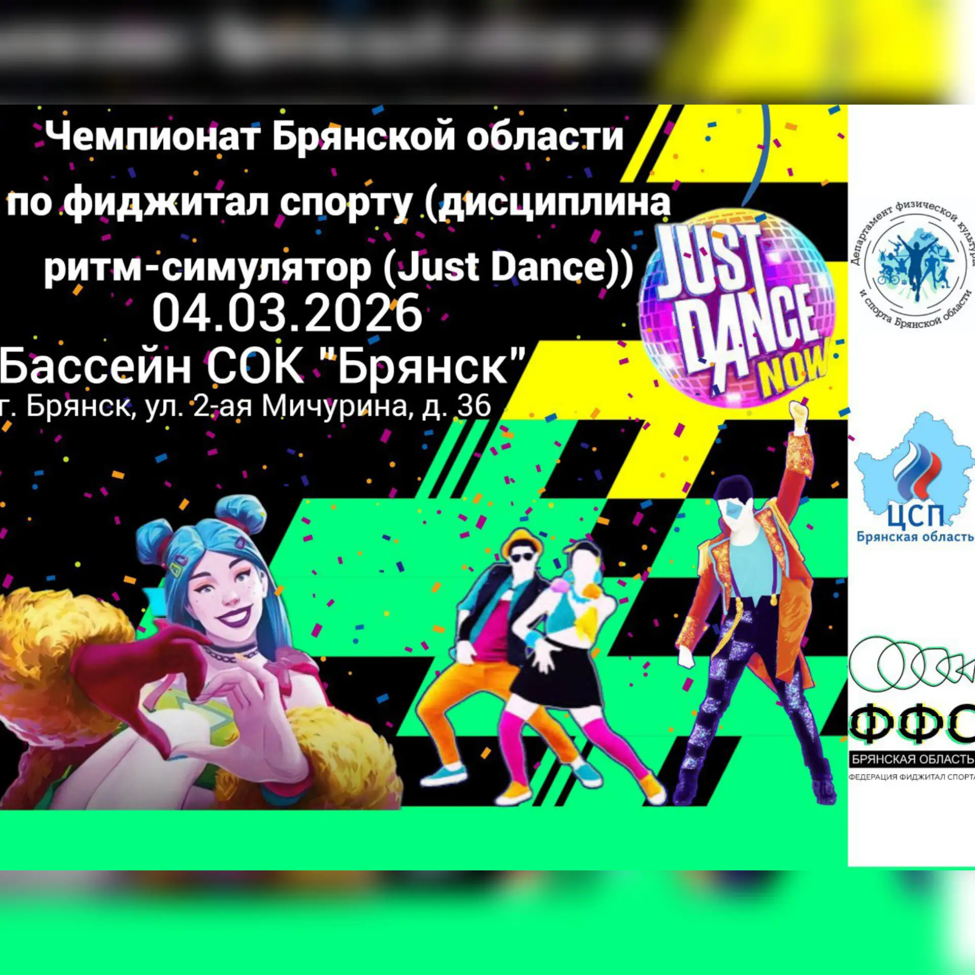 ✅4 марта 2026 года в Брянской области пройдет знаковое событие – чемпионат Брянской области по фиджитал спорту, а главной его дисциплиной станет зрелищный и увлекательный ритм-симулятор Just Dance.