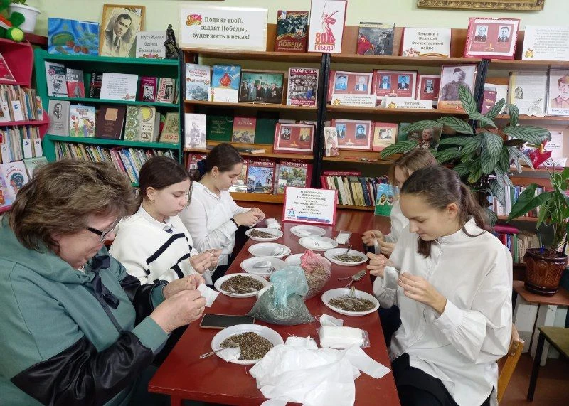 В библиотеке села Малая Бугульма волонтёры подготовили очередную партию лечебного травяного чая для отправки в зону специальной военной операции. Было расфасовано 800 пакетиков ароматного напитка.