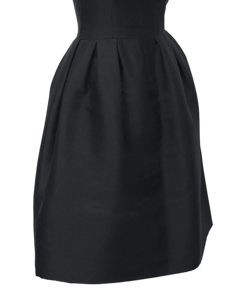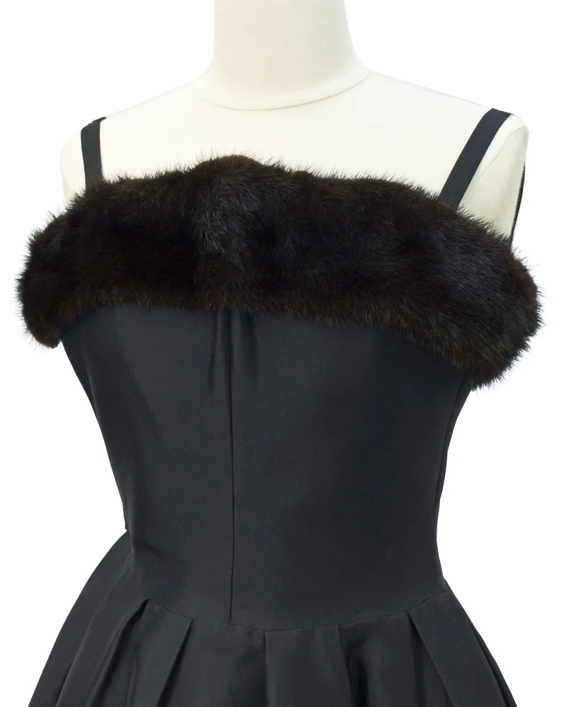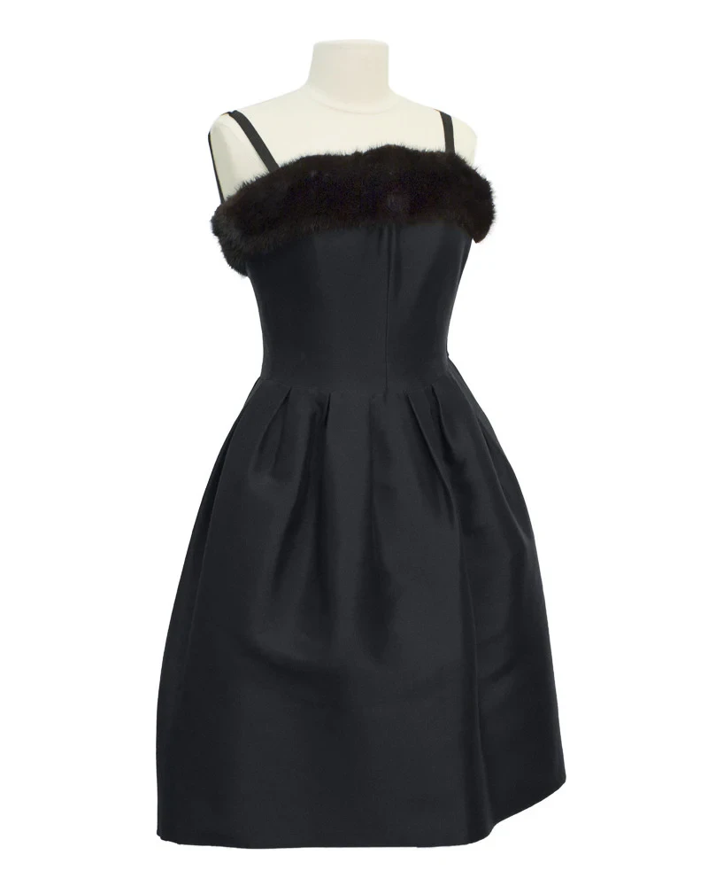 Элегантное коктейльное платье из черного шелка, сшитое в конце 1960-х годов, с приталенным бюстье-корсетом и лифом, отделанным темно-коричневым мехом норки. Пышная юбка придает платью дополнительный объем.