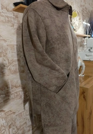 Так как расход ткани на жакет с цельнокроеным рукавом получился большим, и пришлось втискивать брюки. Пояс получился собранным из трех частей. По той же причине отсутствуют манжеты.