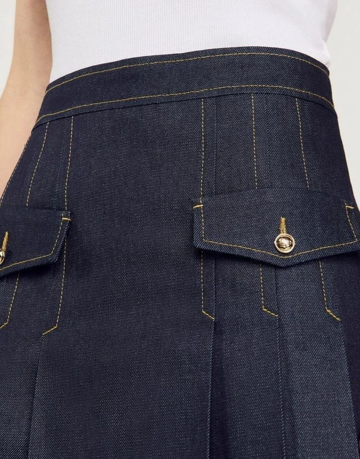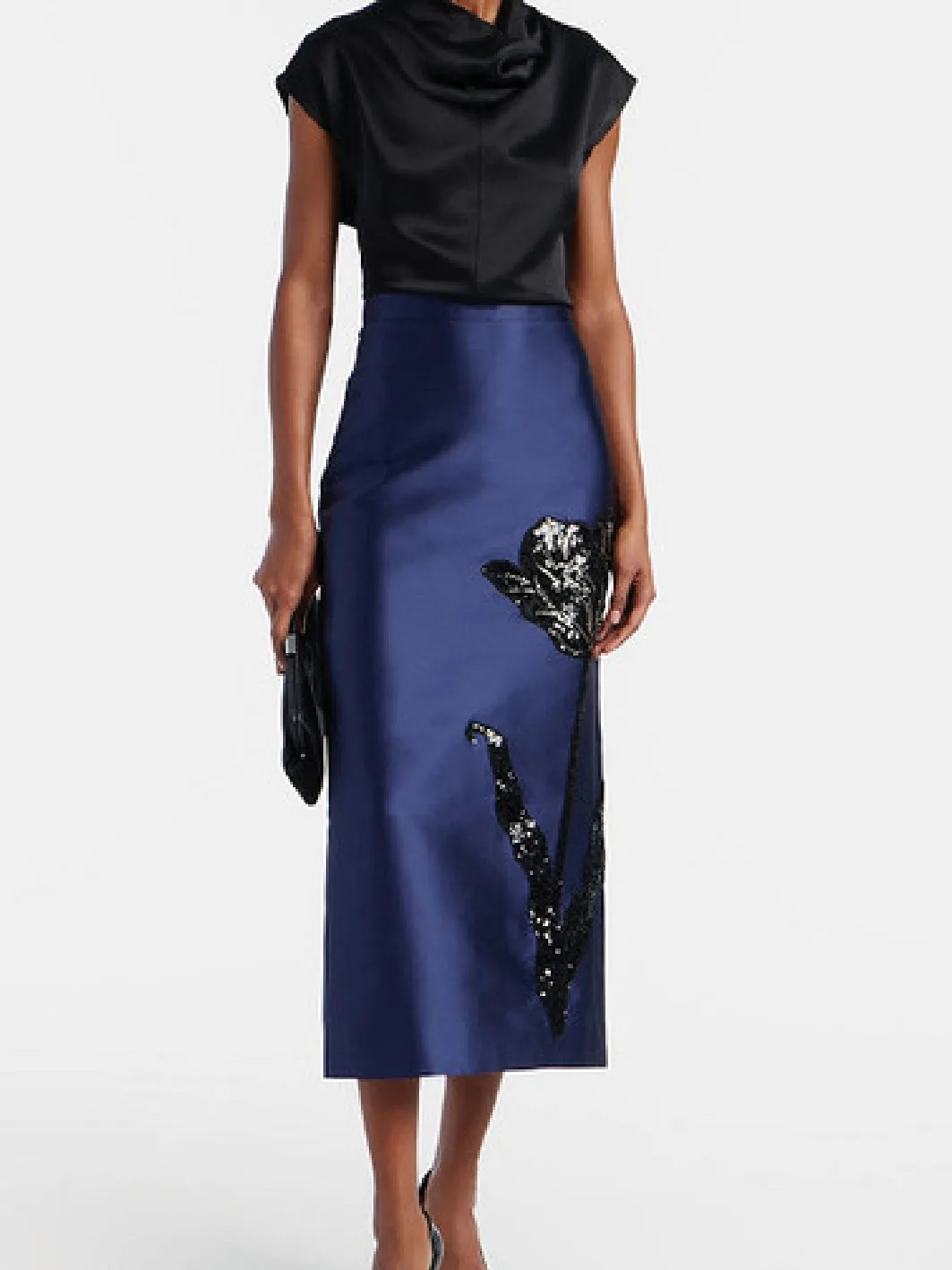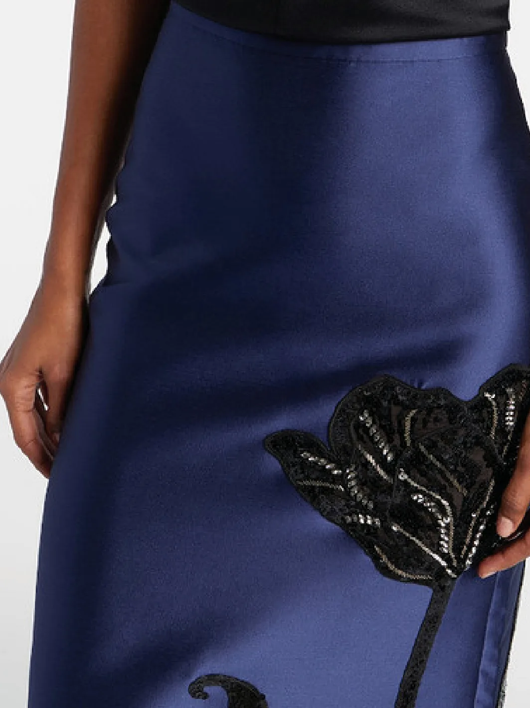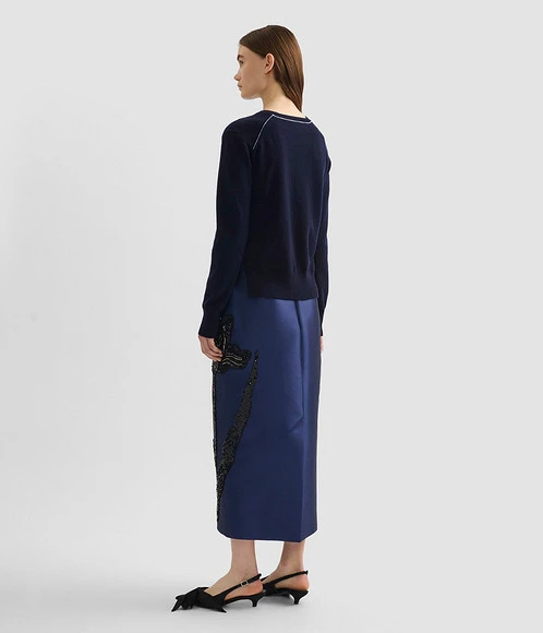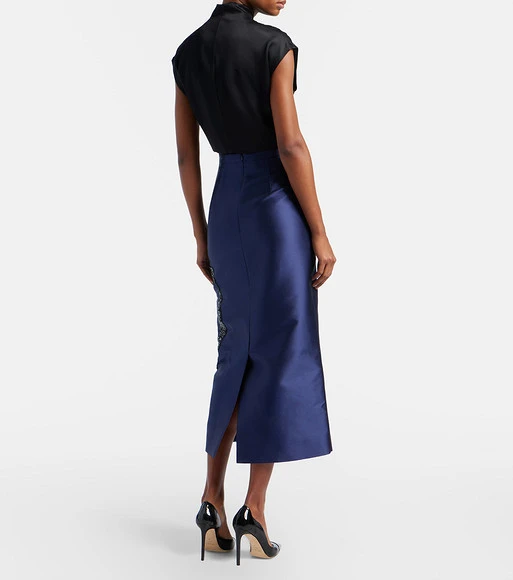 ➡Силуэт юбки в длине миди максимально лаконичный — отрезной пояс находится на уровне талии, задние детали включают по одной вытачке, в центральном шве находится потайная молния и шлица. Юбка сшита из темно-голубого микадо, ткани, превосходящей атлас по плотности и сложности плетения. Ее состав — полиэстеровые и шелковые волокна. Этот материал почти не мнется и идеально подходит для декора вышивкой, стразами и различными бусинами.