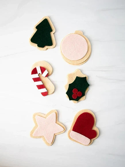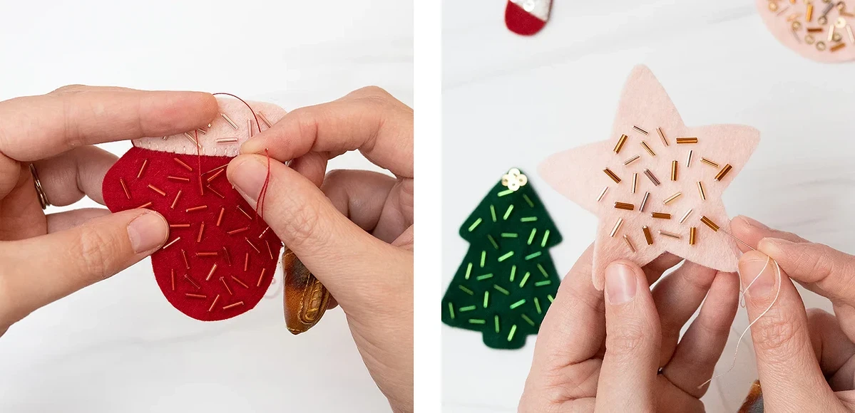 Для создания декора вам понадобится шаблон для распечатывания, фетр песочного цвета, красного, темно-зеленого, белого и нежно-розового, мулине в цвет песочного фетра для сшивания деталей, наполнитель для придания объема и разноцветный стеклярус и пайетки, а также швейные нитки для их пришивания.