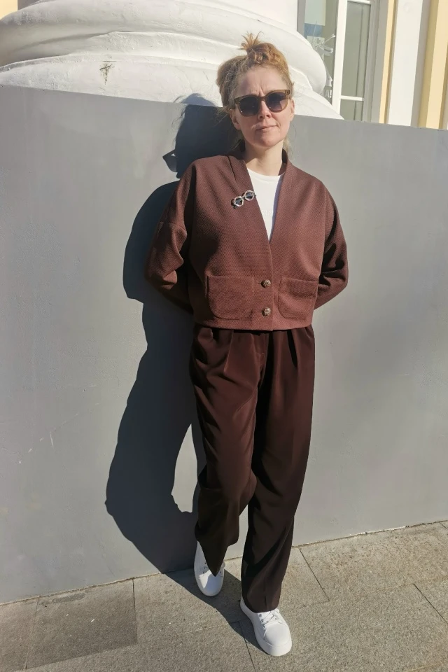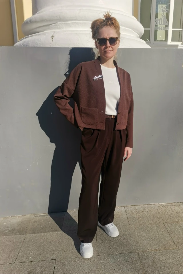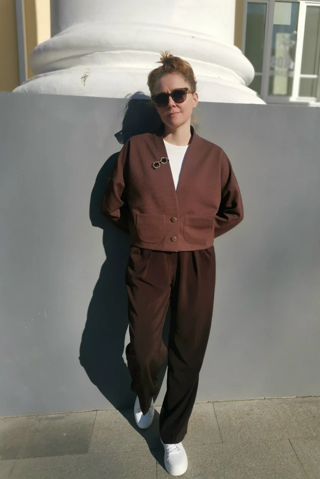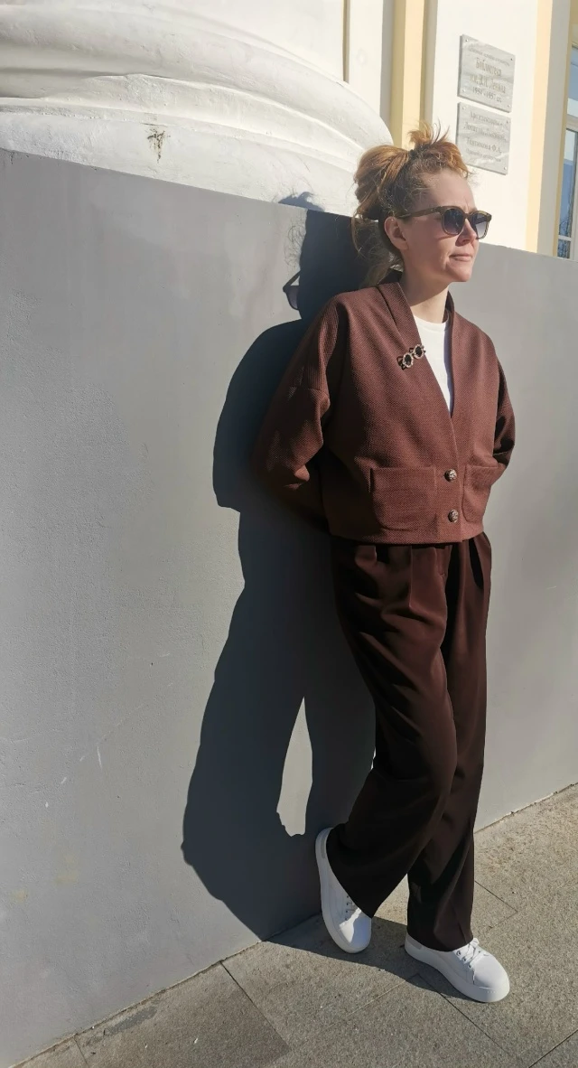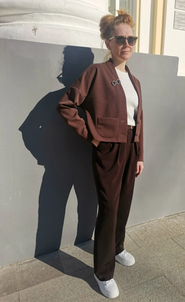 Брюки шила 36 размера, хотя по меркам у модели 38 размер. У меня 36, мне они большеваты. Учтите это, кто будет их шить. Жакет без подклада, из трикотажа. Всего каких-то 15 строчек - и он готов. Очень удобный и красивый получился.