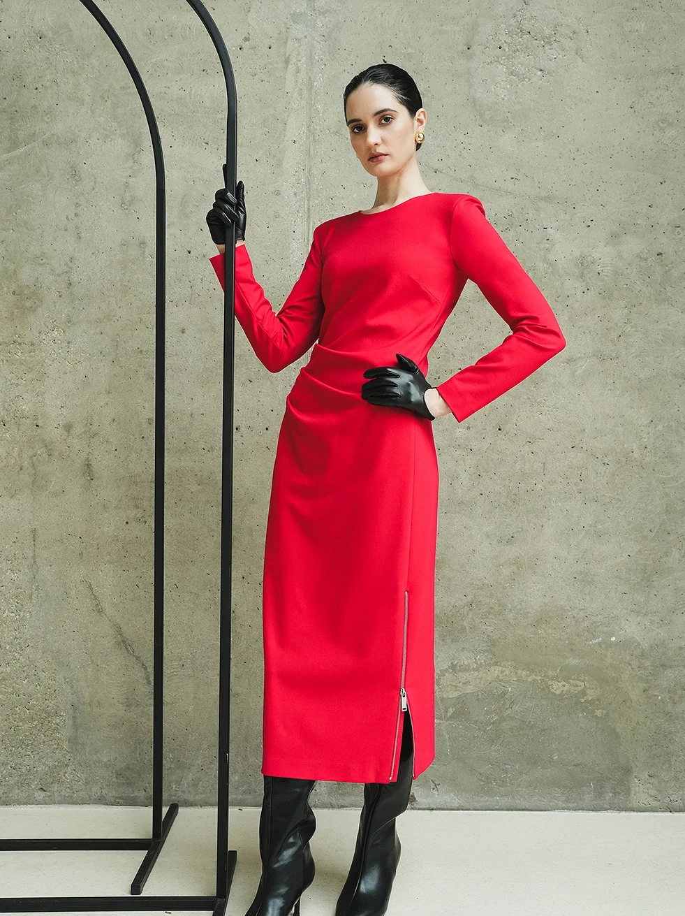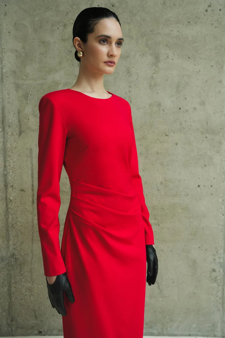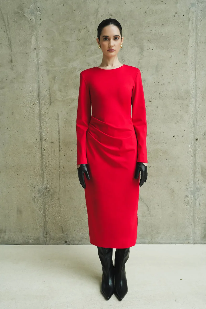 ✔️Трикотажное платье прилегающего силуэта, с асимметричными складками с правой стороны. Вырез горловины округлой формы, обработан обтачкой. Застежка на потайную тесьму-молнию в среднем шве спинки. Рукава платья одношовные втачные, прилегающие. В верхней части оката рукава расположена плечевая накладка. В левом боковом шве располагается разрез, который обработан металлической застежкой-молнией. Длина изделия до середины голени. Низ изделия и рукавов обработан в подгибку с открытым срезом и подшит ручной потайной строчкой.