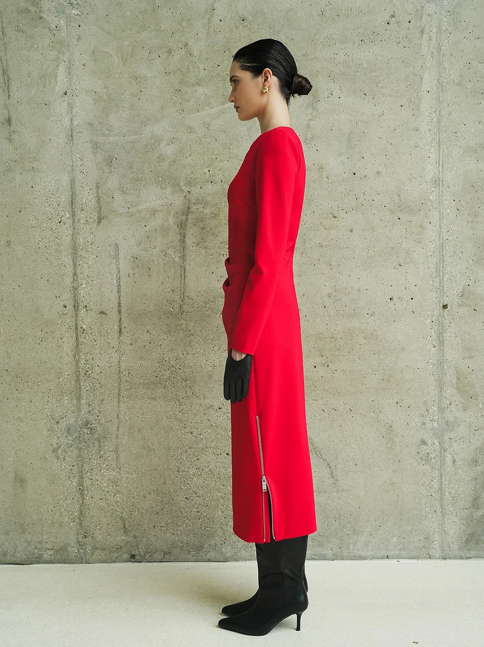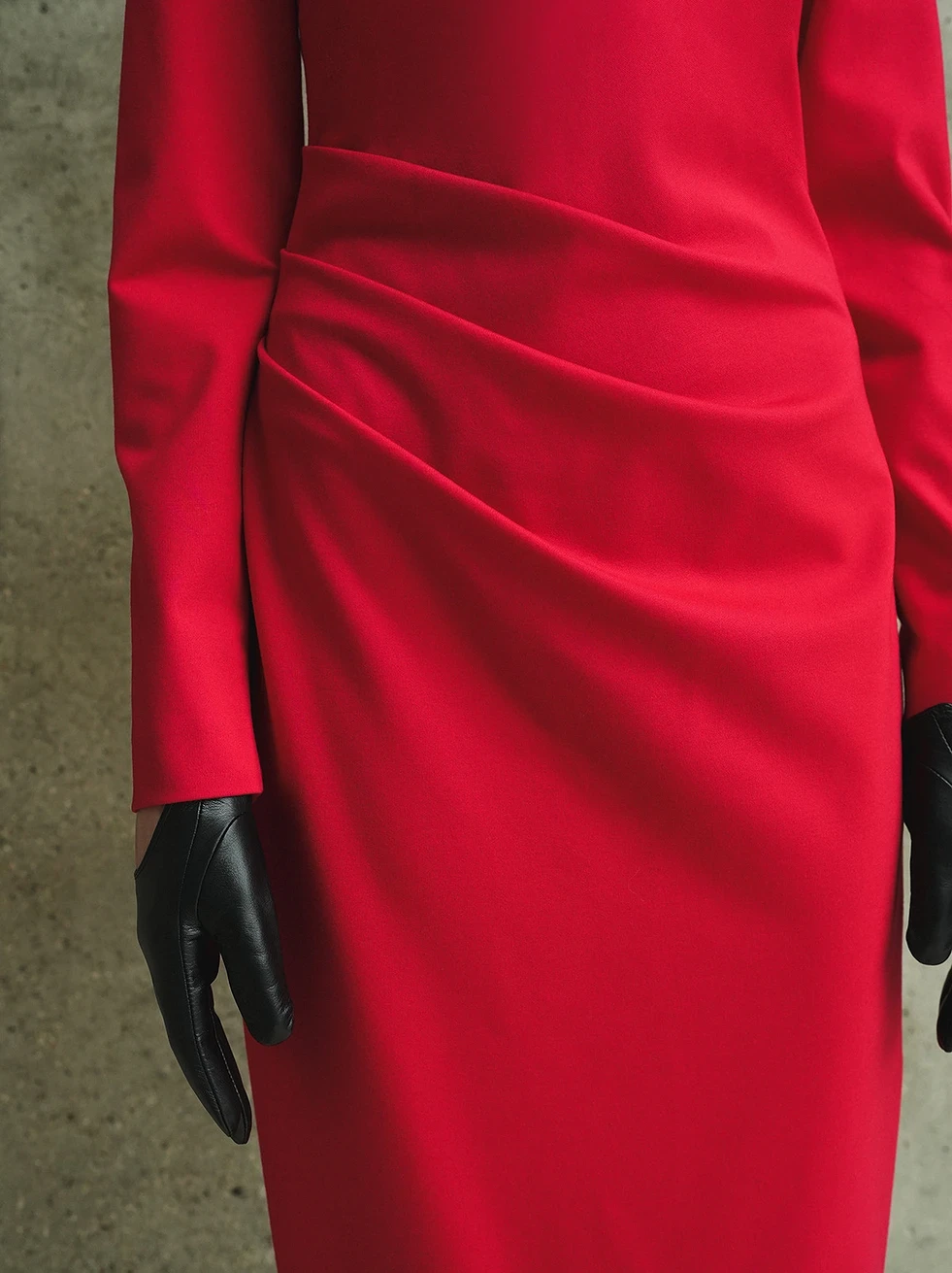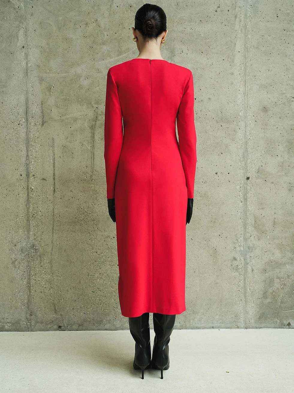✔️Трикотажное платье прилегающего силуэта, с асимметричными складками с правой стороны. Вырез горловины округлой формы, обработан обтачкой. Застежка на потайную тесьму-молнию в среднем шве спинки. Рукава платья одношовные втачные, прилегающие. В верхней части оката рукава расположена плечевая накладка. В левом боковом шве располагается разрез, который обработан металлической застежкой-молнией. Длина изделия до середины голени. Низ изделия и рукавов обработан в подгибку с открытым срезом и подшит ручной потайной строчкой.